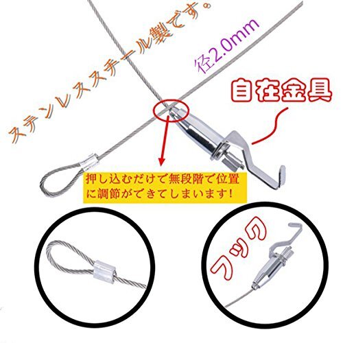 「シュウ氏テクピクチャーレールロープ自在金具付径2.0mm(全長1.0m/6本セット)」▼735870061096▼(商品説明)・ 1.0m ・・PackageQuantity:6Size:1.0m・☆ワイヤー長さ:1.0m、6本セットです。 素材:鋼、ステンレス。 耐荷重約40kg 。・☆応用: 展示会や絵画、額吊りやポスターなどに写真と他の作品展示用。白い壁でも目立ちにくいです。・☆掲示物の位置はフックのピンを押し込むだけ!お好みの高さへ無段階で位置調節が可能です。(長さ調節をする時は吊るす物を外してからやらないと)・☆額縁や掛軸、パネル、ポスターなどをお好みの高さにかけることができます。掲示物から下にはみ出したワイヤーは丸めて裏にまとめることで、壁に傷をつけることなく、パネルがきれいに掛けられました!・☆は安全性に十分配慮して行ってください。後は軽く引っ張るなど、安全性を確認してください。説明 耐荷重:約40kg セット内容:ワイヤ―6本