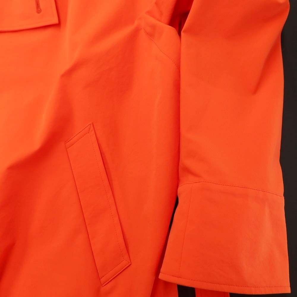 程よくハリのあるポリエステル系生地を使用した、2023年秋冬のロングコートです。鮮やかなレッドオレンジカラーがコーディネートに映える一着で、シングルとダブルの着こなしやシルエットの変化がお楽しみいただける一着です。
