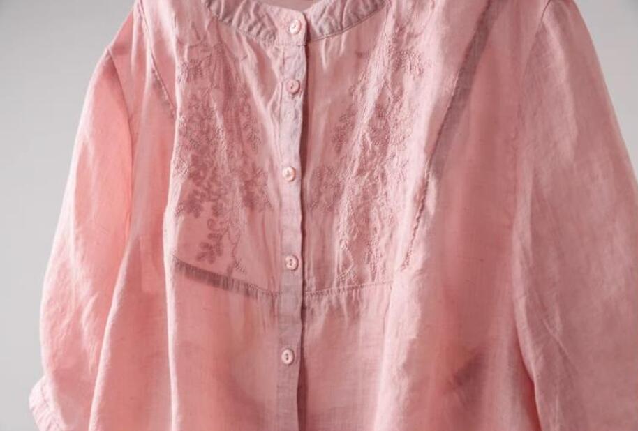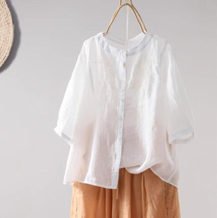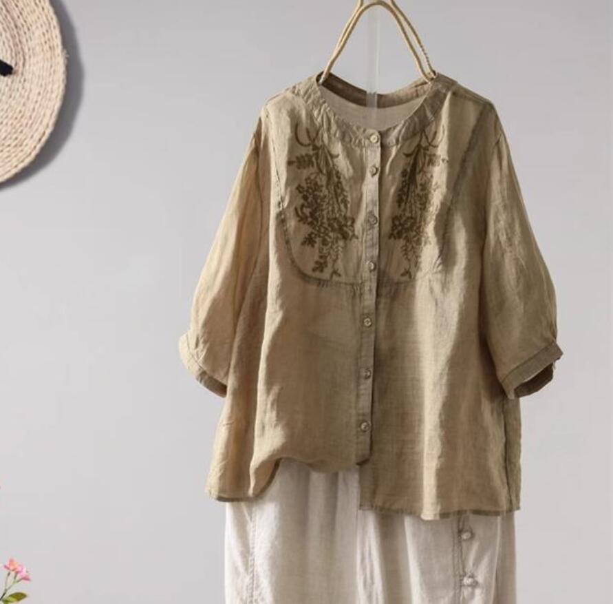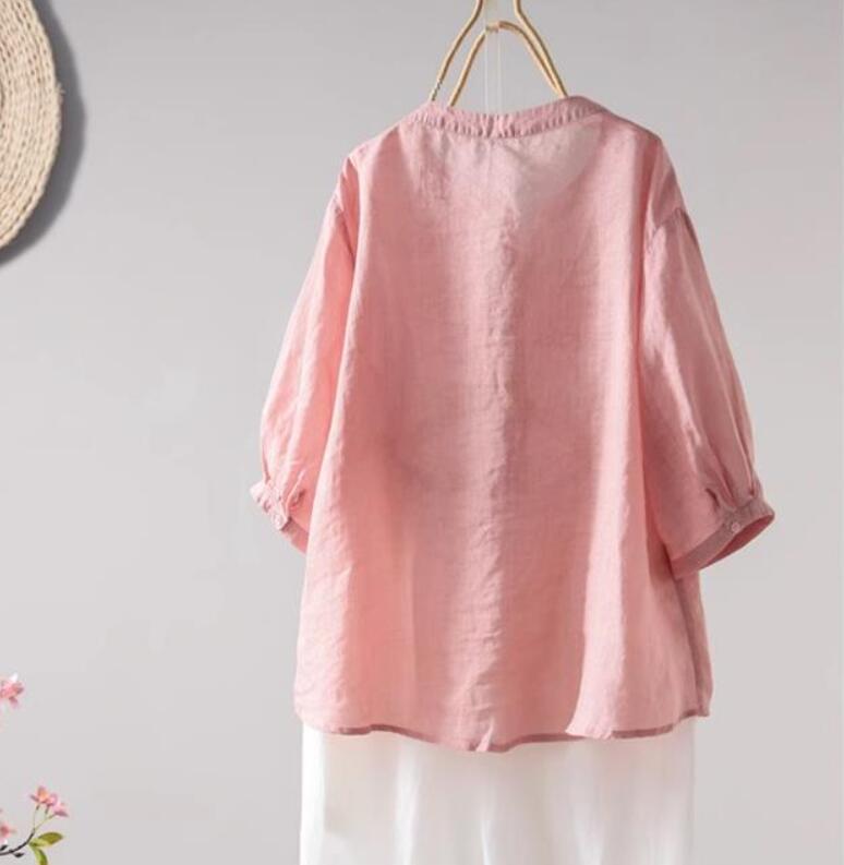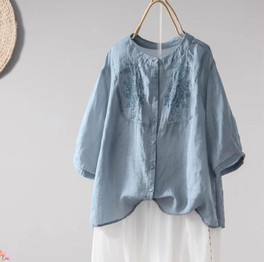 新品~チュニック シャツ ブラウス きれいめ ナチュラル 着痩せ ゆったり 無地 涼しい トップス 綿麻 七分袖 ブラウス~ブルー