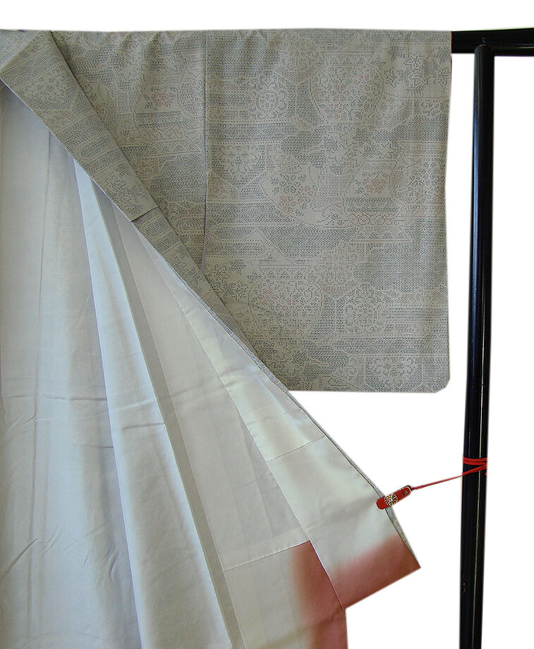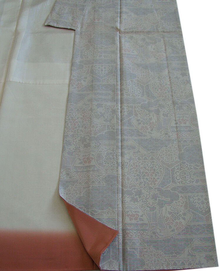 | 商品説明 | こちらのお品は「袷」ですので10月から5月までお召頂ければと思います。 しなやかな紬は、着易く動きも軽く、着くずれしない腰の強さを併せ持った お洒落着としていつでもどこへでもお気軽にお愉しみ頂けご愛用頂けるお品です。 とてもしなやかな肌触りも心地よいふっくらとした真綿紬地は、 渋い白鼠色地にエンジ、灰青色等の壺、花、雲取り等の織柄、 八掛は珊瑚朱色(正絹)と、幅広い年代の方にお召し頂けます。 |