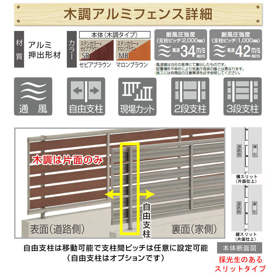 | 商品詳細 | この度は数ある商品の中から当商品を閲覧頂きまして有難う御座います。 商品定価 47,410円 ⇒ 販売価格 21,340円(送料・税込み) サイズも充実。木目調の高品質フェンス。 柱ピッチを1m以下にする事により耐風圧強度が42m/秒になり強度が1.5倍アップ! 横向きのデザインのため、連続で設置することにより統一感が出ます。 お庭の外構はもちろん、駐車場、土地の境界線など、どんな場所にもマッチします。 アルミ製木調フェンス横スリットタイプ 本体1枚(柱別) サイズ:幅:1998mm 高さ:GLより1200mm カラー:表面マロンブラウン/裏面ステンカラー (木調カラーの裏面(家側)はステンカラーになります。) 上下胴縁:33×25(mm) 耐風圧強度:支柱ピッチ2000mmの場合、風速34m/秒相当 支柱ピッチ1000mmの場合、風速42m/秒相当 材質:アルミ形材(オレフィンシート) こちらの商品はフェンス本体1枚のみの商品です。 柱やコーナー部材、キャップはオプションにてご提供可能です。 複数枚お求めの場合や、オプション品をセットでご希望の場合は、 オーダーフォームご要望欄にてお知らせ下さい。 折り返し、合計金額をご案内させて頂きます。 (オプション品のみ後日ご注文の場合は、別途、送料を頂戴致します。) 枚数やオプション品が不明な場合は、ご質問欄よりお気軽にお問い合わせ下さい。 【施工のご注意】 ・H1400は、支柱芯間隔を1000mm以内で施工して下さい。 ・支柱と本体連結部の間隔は、200mm以下に施工して下さい。 ・コーナー部には安全のため、支柱を2本施工して下さい。 ・直線で連結する場合は、連結部品は柱に付属しているので、柱をご注文頂けたら、 継手やジョイントは不要です。 ・コーナー部材は、コーナーカバー・コーナー継手よりお選び下さい。 但し、コーナー施工でアンダーカバーを取り付ける場合は、アンダーカバー用の コーナーカバーをお使い下さい。 ・H1200用支柱は、サイズが26×40(mm)となっています。 ・オレフィンシートと使用した商品は事前に設置場所を確認して下さい。 給湯器、暖房器などの排気熱が商品に直接当たらないよう施工して下さい。 熱による変色・劣化のおそれがあります。 ・木調を再現したデザインの為、多少の色差があります。 |