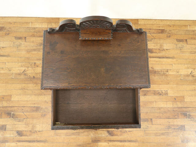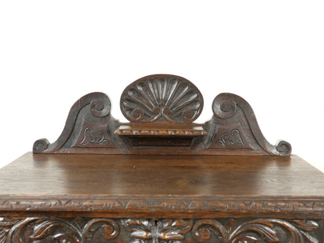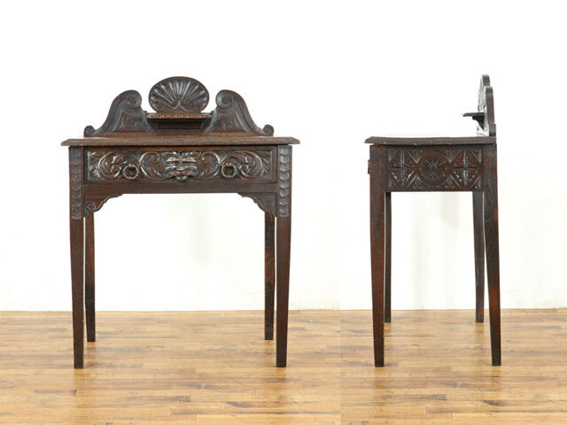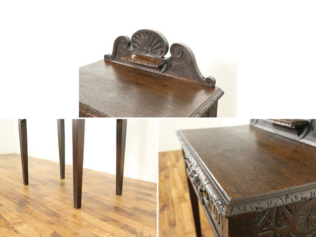 側面にも彫刻が施されていたり、天板上の飾り部分にも小さな棚が付いていたりと非常に手の込んだデザインと言えます。