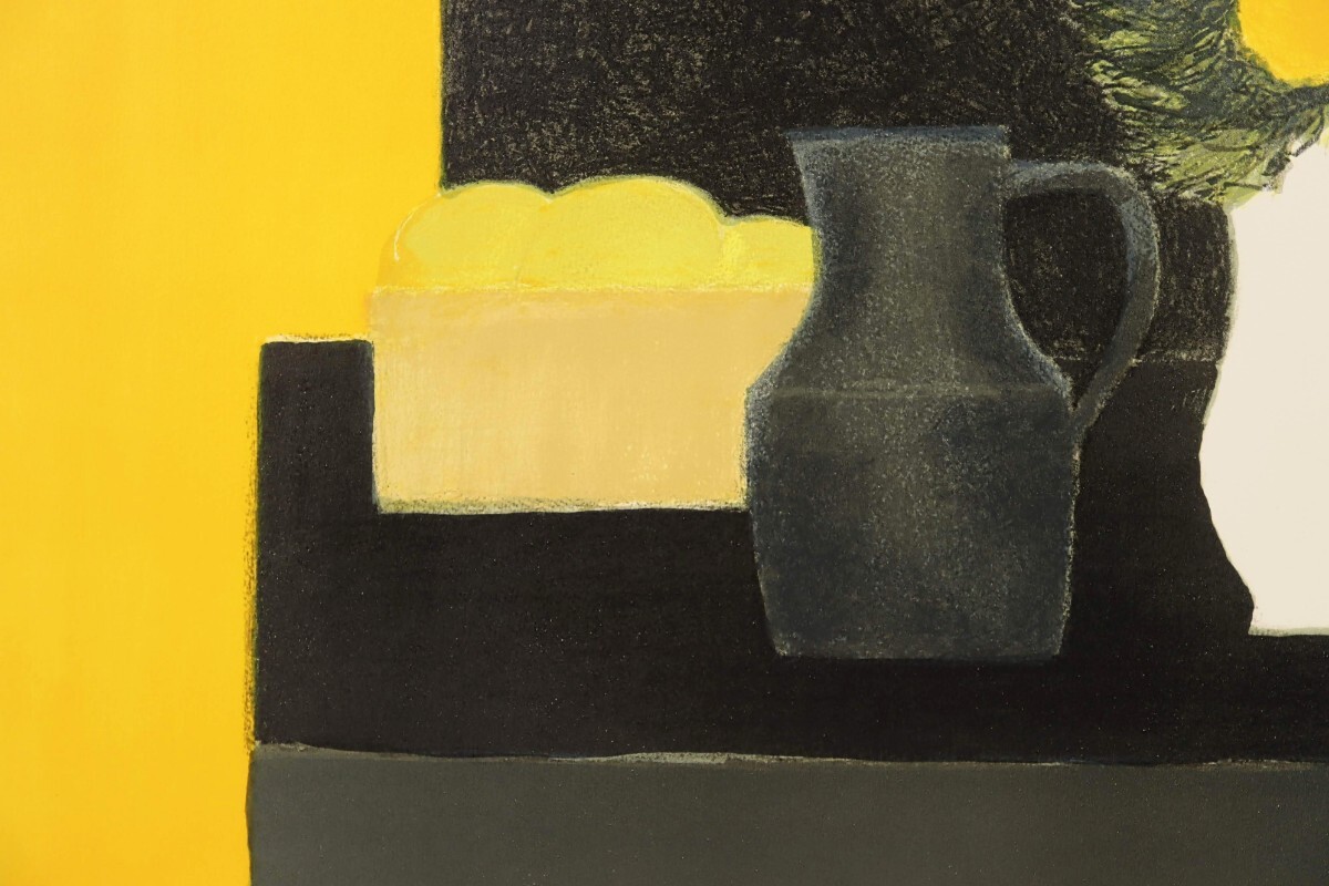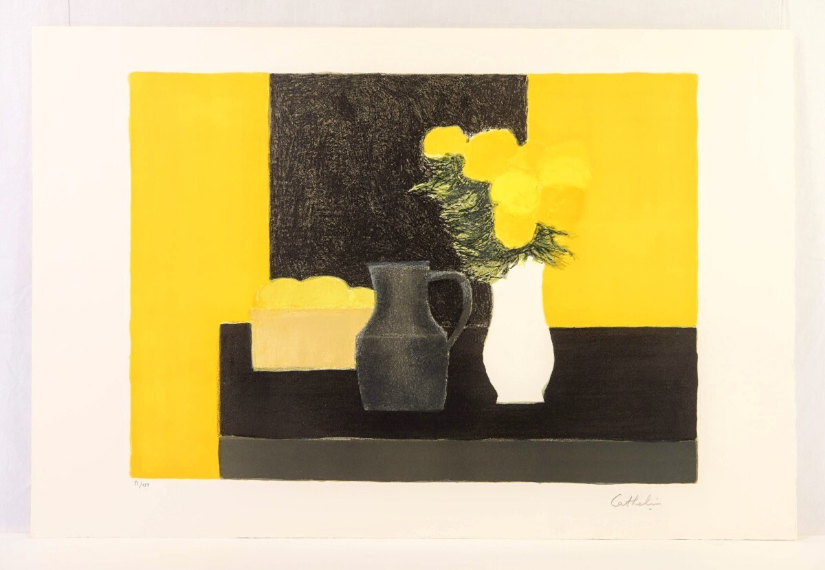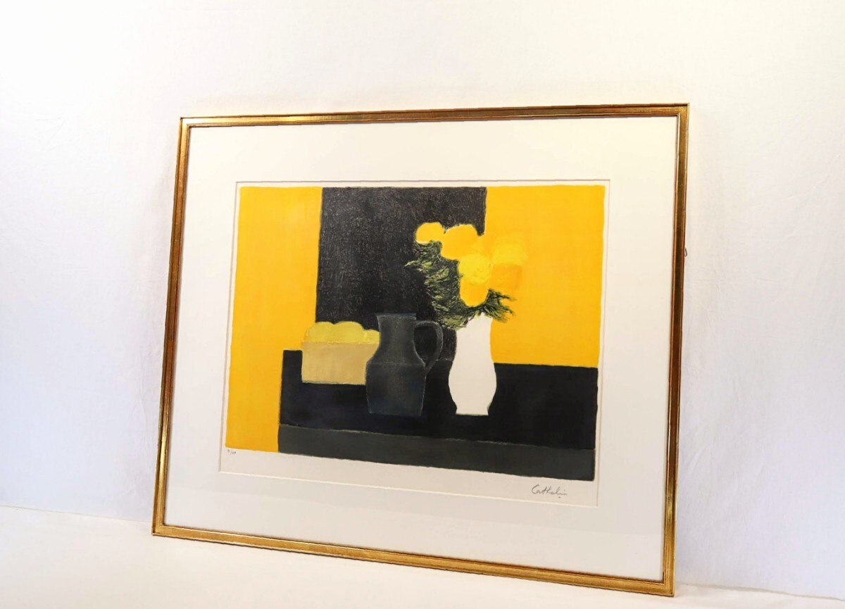 真作 ベルナール・カトラン 大判リトグラフ「ビクトリア調の花瓶とレモンバスケットのある静物」画67×48cm 抽象化簡素化し明色彩やか 9212