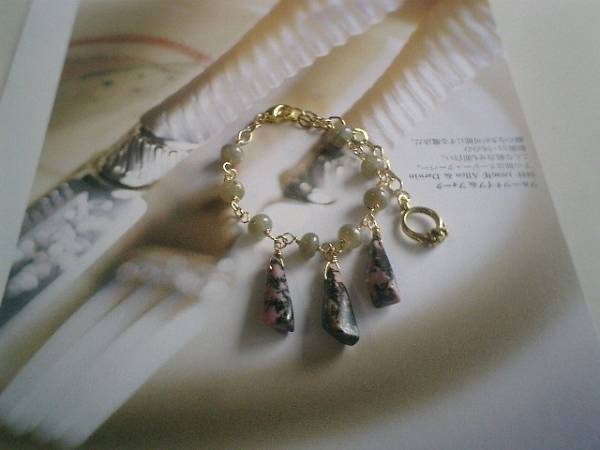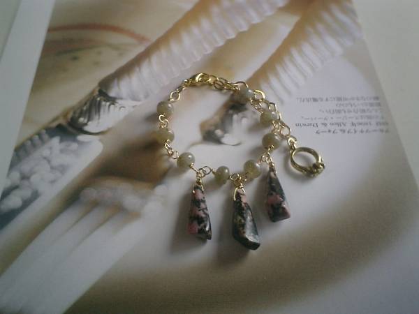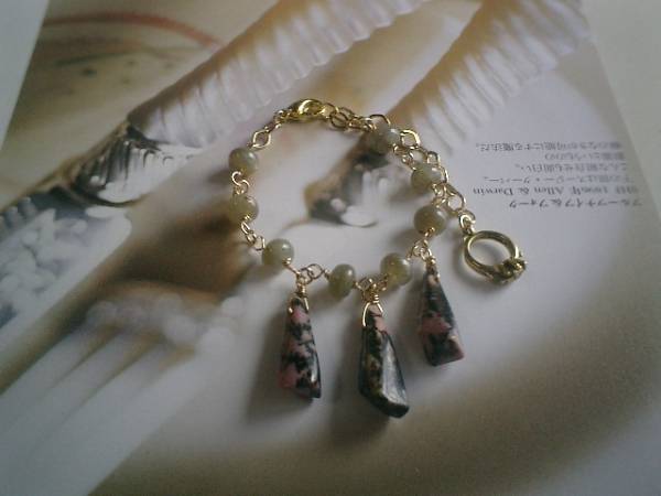 素敵・マニア・・シリーズです♪神秘的なラブラドライトのブレスレットです♪個性的なロードナイトの柱型やデザインチェーンを合わせてアート・モダンしています♪ラブラドライトは8ミリ位のボタン型、ロードナイトは23ミリから25ミリ位までです♪長さは全長23センチ位で調節自由です♪お揃いのネックレスやイヤリングも出品しています♪シンプルで飽きのこないいつまでも着けられるデザインを考えて作りました♪ハンドメイドをご理解頂いてノークレーム、ノーリターンでお願いします