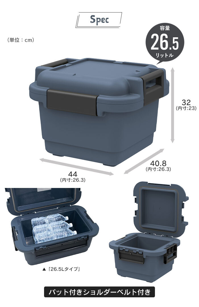 | [本体・フタ・ハンドル・ベルト]ポリプロピレン [バックル]ASB樹脂 [フタパッキン]発泡ポリエチレン [断熱材]発泡スチロール |