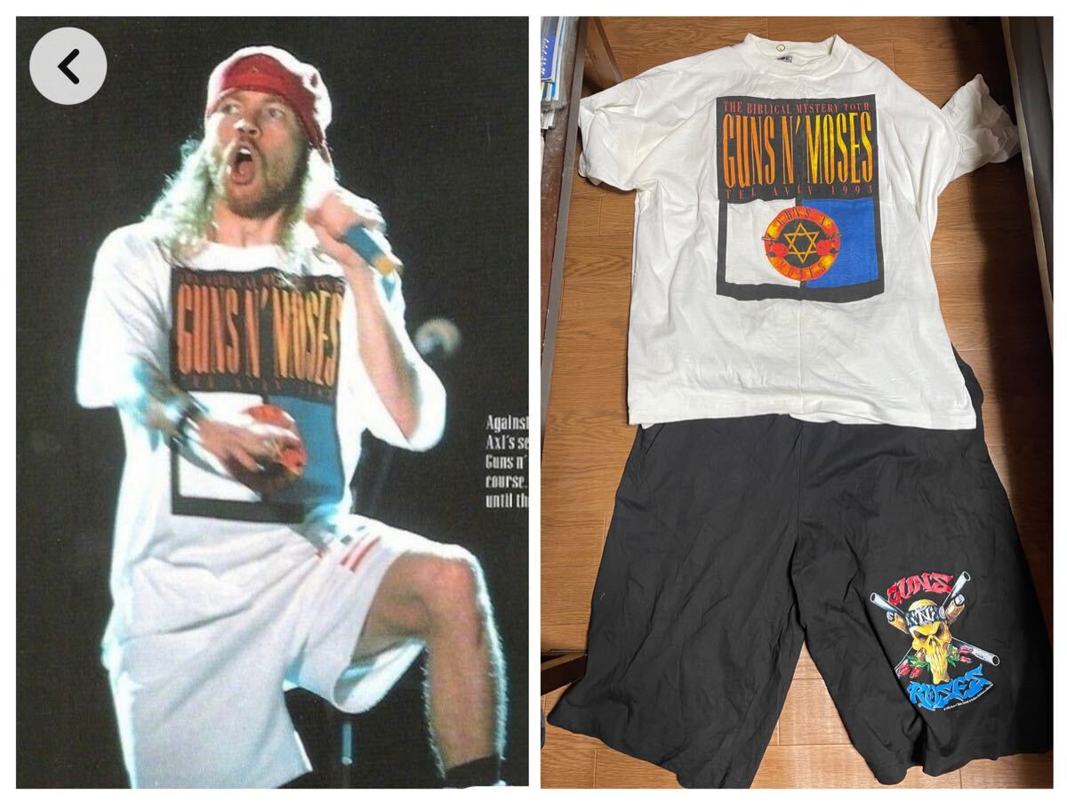 vintageのguns n rose のショーツになります 当方axl roseのファンで彼のファッションに憧れて彼がステージやプライベートで着用していたショーツを長い間探してきました20年以上探し続けて当時のセキュリティの方やリアルタイムでコンサートを見にいった方やgunsのコレクターの方に話しを伺う機会があり市場であまりに彼が着用したショーツやgunsのショーツ自体が見つからない為当時物販でショーツを販売していたか尋ねたところ当時物販ではショーツを販売しておらずaxl roseが着用したショーツやgunsのショーツはaxl rose専用やプロモ用で当時のセキュリティスタッフや極少数の関係者に配られただけだったそうです(当時のセキュリティの方に直接聞いたので間違いないです) 今回出品させて頂きますのは当時のセキュリティの方から未使用を譲って頂いた大変希少な一品になります guns n rosesのファン必見のコレクターズアイテムになります サイズはxl (紐で調整可能ですのでほとんどの方が着用可能です)是非ご自分のガンズtシャツと合わせてみて下さい(画像4参考コーデ)自己紹介の注意事項をよく読みご検討よろしくお願い致します