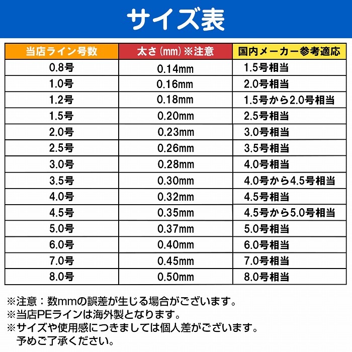 ※当店取り扱いPEラインは海外製のため、日本メーカーに比べると比較的太い造りとなっております。