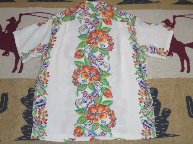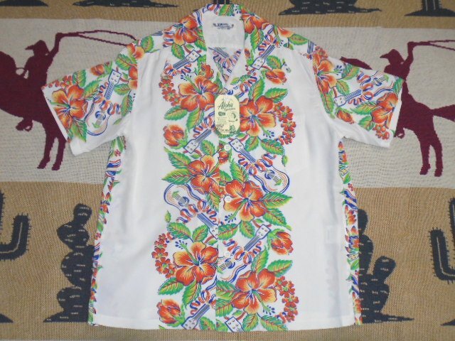 ハワイの象徴ともいえるレイ、ウクレレ、ハイビスカスをメインモチーフに、ボーダー・パターンを構成した人気のデザイン。アロハシャツの柄としても採用される頻度の高いそれらのモチーフが 6色の抜染の手法により、互いが引き立てられるよう表現されている。また、描かれている図柄の大きさやレイアウトのバランスなど、デザインとしての完成度も高い。コレクターからの支持も厚く、ヴィンテージ・アロハシャツを扱う書籍にも掲載されている。