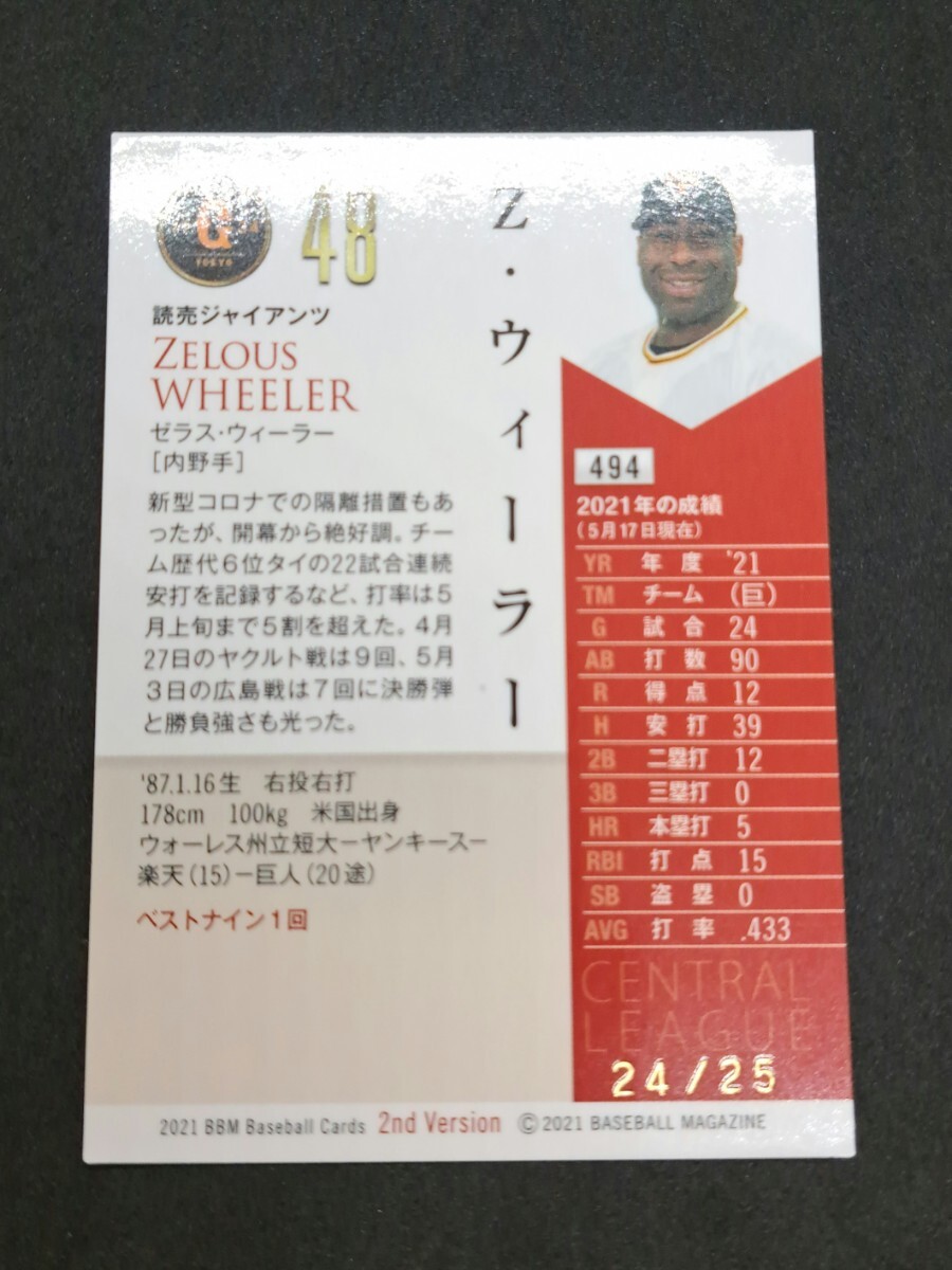 読売ジャイアンツ ゼラス・ウィーラー選手の25枚限定赤箔サインパラレル版カードです。