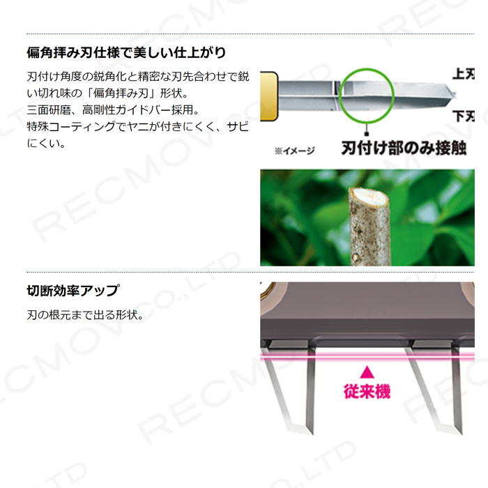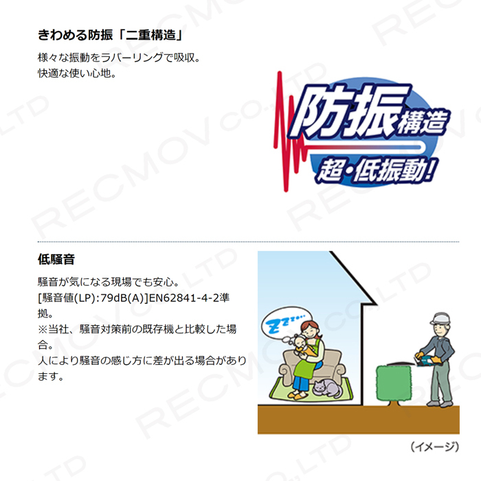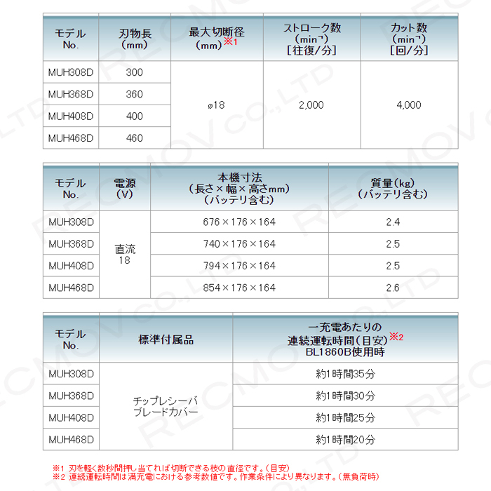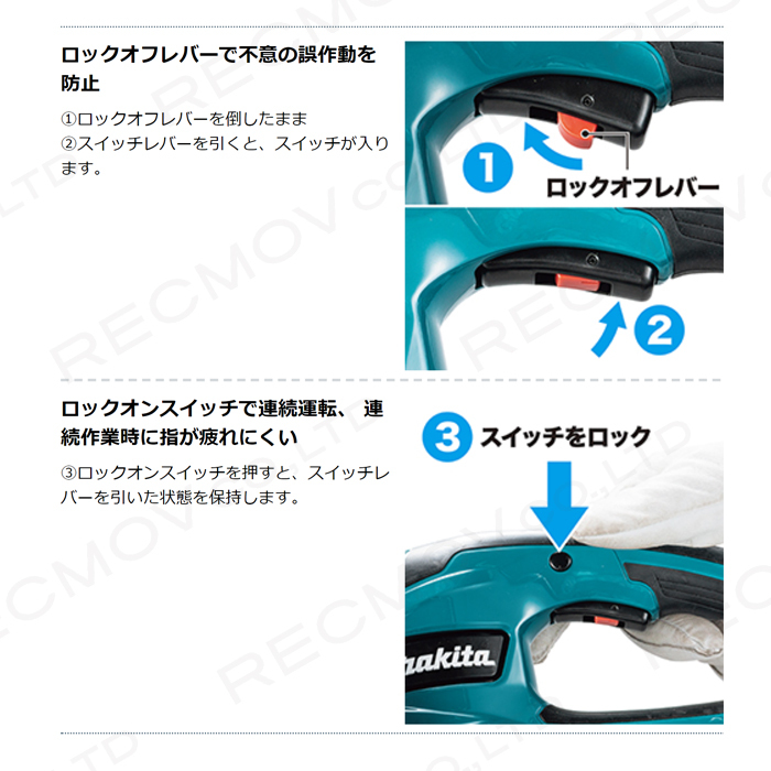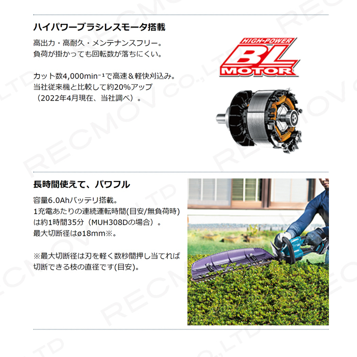 刃物長:300最大切断径(mm)※1:φ18ストローク数(min-1)[往復/分]:2000カット数(min-1)[回/分]:4000電源(V):直流18本機寸法※2(長さ×幅×高さmm):676×176×164質量(kg)※2:2.4標準付属品:チップレシーバ、ブレードカバー1充電あたりの連続運転時間(目安)※3[BL1860B使用時]:約1時間35分※1.最大切断径は刃を軽く数秒間押し当てれば切断できる枝の直径です。(目安)※2.寸法・質量はバッテリを含む。※3.連続運転時間は満充電における参考数値です。作業条件により異なります(無負荷時)ヘッジトリマー 充電式 マキタ コードレス 電動 高枝バリカン トリマー トリマ バリカン バッテリー 充電 バリカン トリマー 植木 生垣 剪定