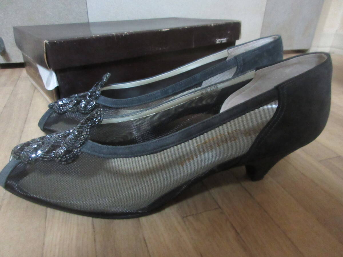 表示サイズ24㎝、ヒール高さ5cm。1度使用しただけだったと思いますので状態はきれいなのですが長期保管ですのでお手元でヒールのゴムだけ変えていただいた方がいいかもです。箱なし定形外¥660でお送り可能です。もちろん同梱大歓迎。