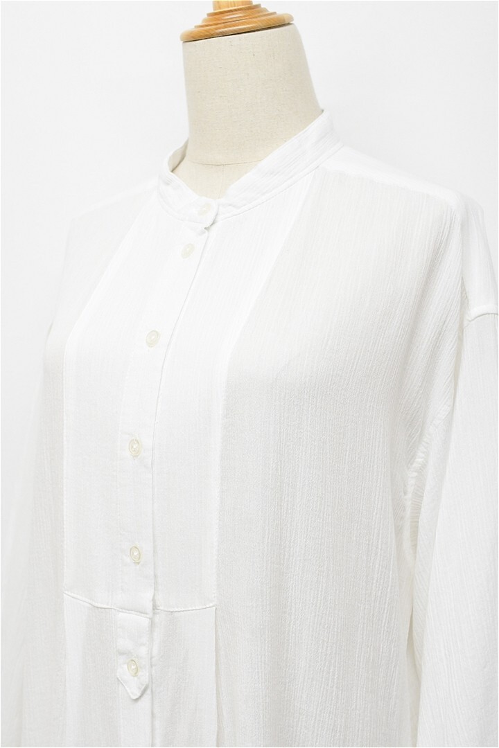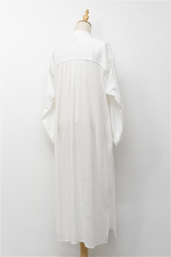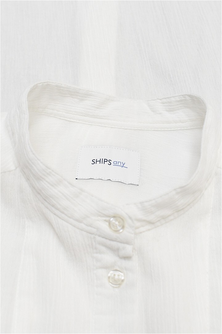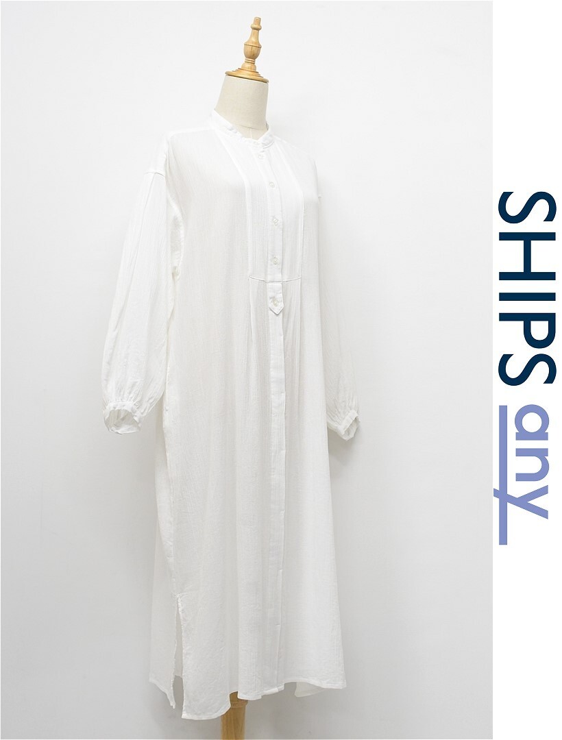 I382/美品 SHIPS any シャツロングワンピース ドレス シボ感 バンドカラー 長袖 比翼ボタン コットン フリーサイズ Lサイズ 白