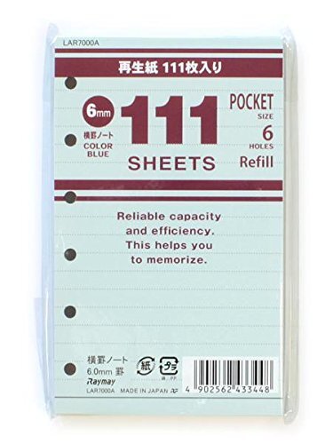 | 横罫ノート。6.0mm罫(ミニ6穴サイズ/ポケットサイズ)。。サイズ:縦=126mm 横=76mm 厚さ=11mm。商品色傾向:水色。。 |