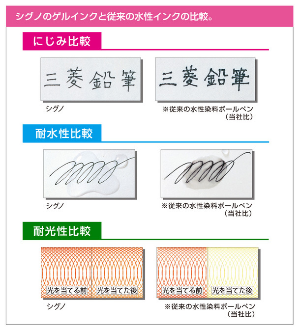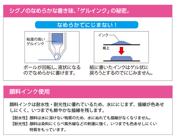 シグノは、ずっと鮮やか、にじまない。顔料インクを使用しているので、光による色あせに強く、水に滲みません。