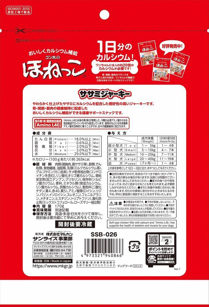 人の約20倍のカルシウムが必要な愛犬のために作られた、やわらかおいしいササミジャーキーです。