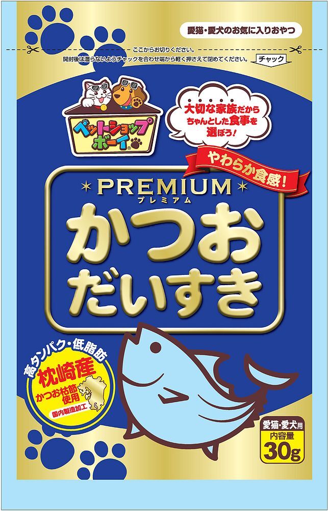 ・PREMIUMかつおだいすきは、「原料は鹿児島県枕崎産100%」「独自製法でうま味が濃いかつお節を使用」「一般品よりも薄く削ったやわらか仕立て」の、原料と製法にこだわったプレミアムなおやつです。