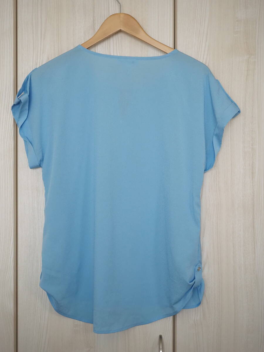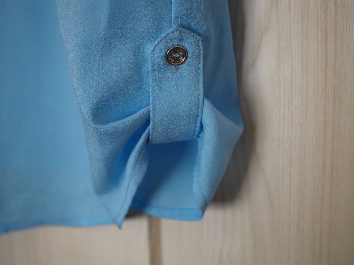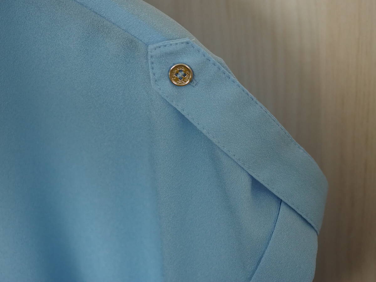 明るめの水色で実物の色は画像7が一番近く感じます。右胸に小さなひっかけ(画像8)