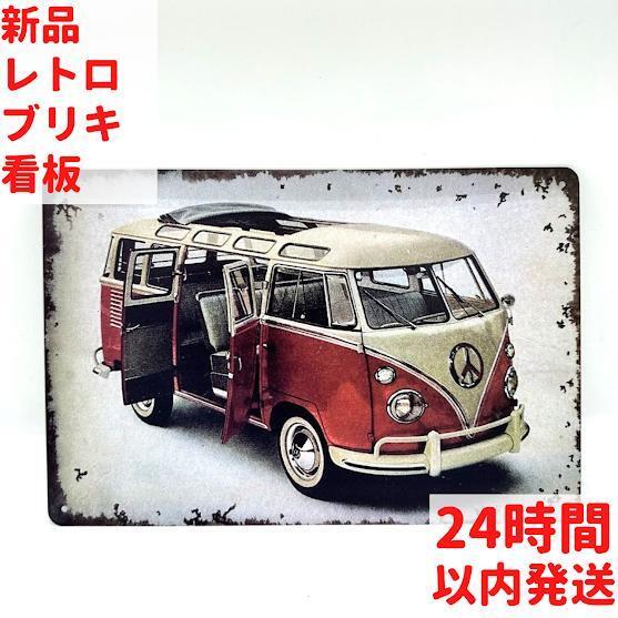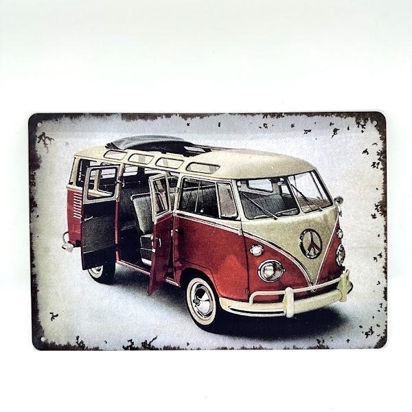 このブリキ看板は、クラシックなフォルクスワーゲンバスをモチーフにしたデザインが特徴です。