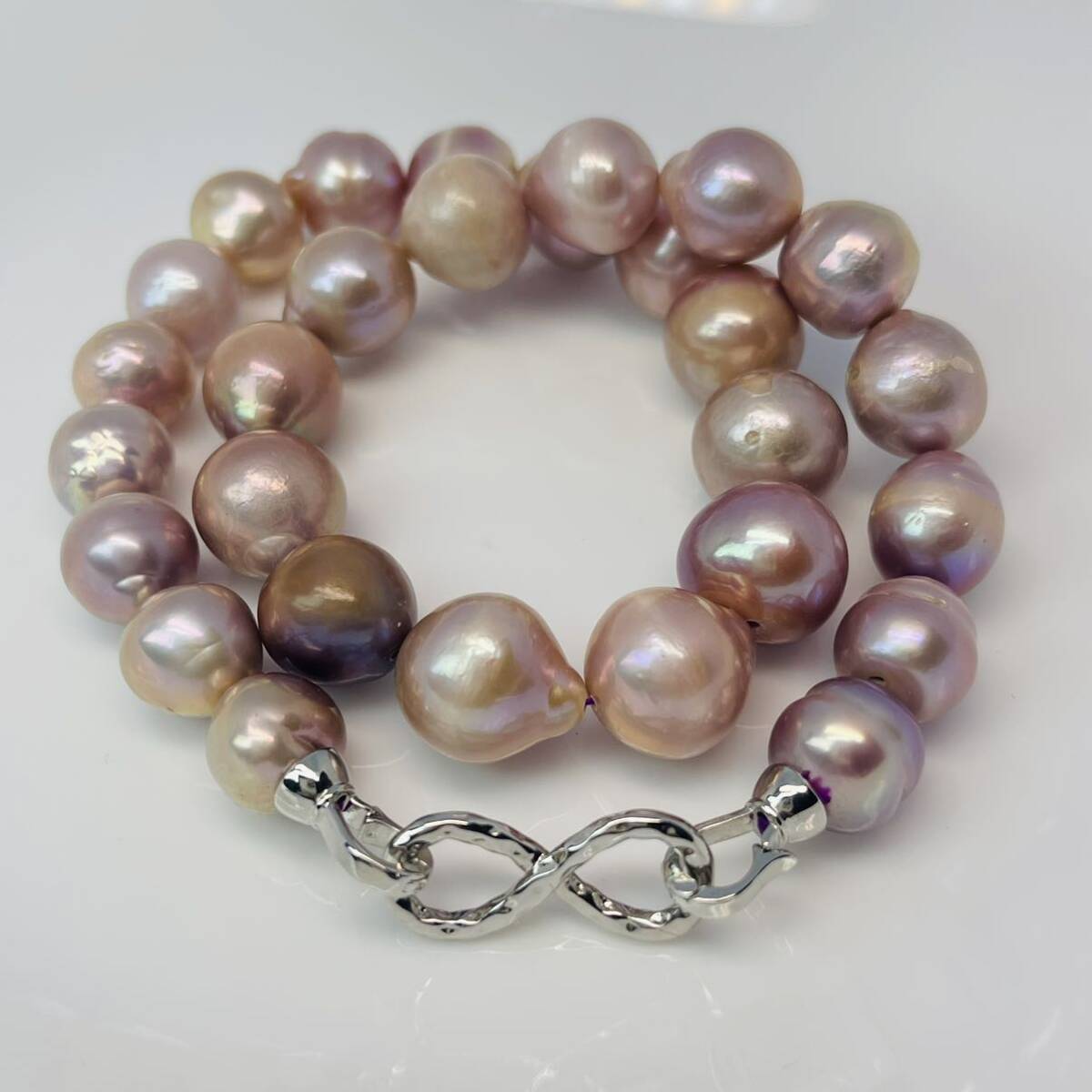 淡水パールは核がないため、丸い近い形で育つものは非常に稀。バロック型といわれる、いびつな形のものが一般です。しかも7-9mmの大きさになるまでは5~6年もの長い年月がかかります。約8年もかかる10mm玉となる と、1万個にひとつしか出来ない稀少な名品です。
