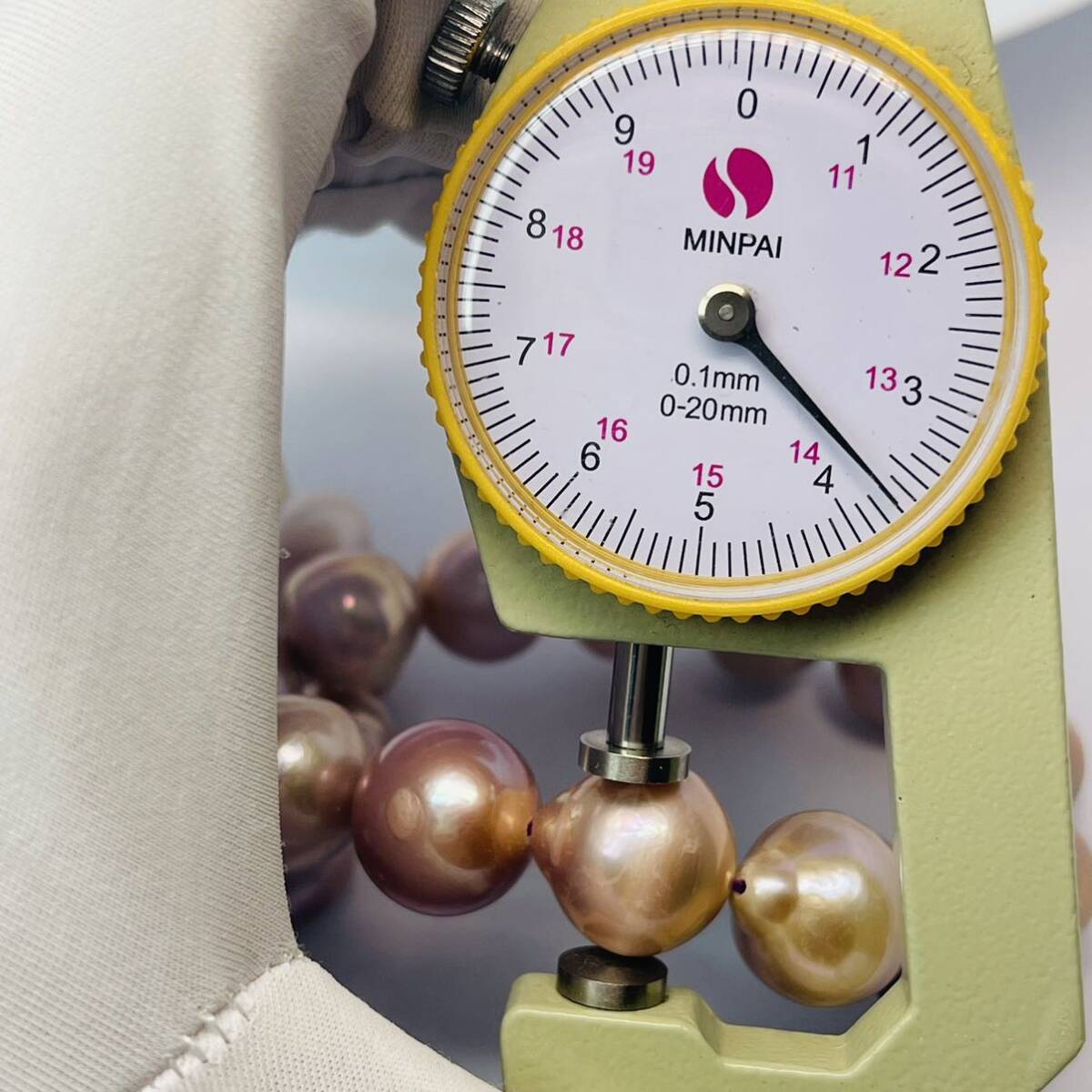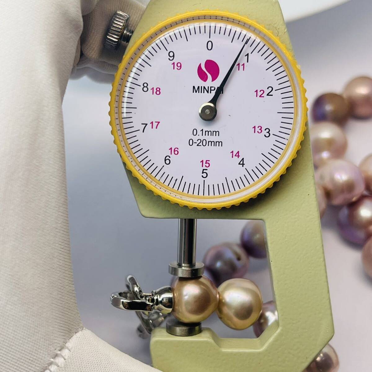 養殖される真珠のほとんどは玉の中の「貝核」を中心として真珠層を作ります。8mmの真珠の場合、貝核の大きさ は7.5mmくらいなので真珠層はわずかしかありません。淡水パールはこの「貝核」を用いずに養殖されるので、一 粒すべてが真珠層でできているのです。