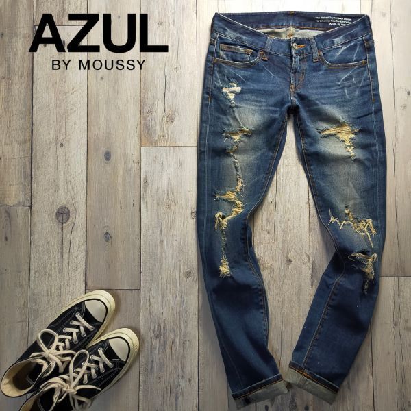 ☆AZUL by moussy アズール☆USED クラッシュ加工 ストレッチ スキニー デニム レディース W25 S941