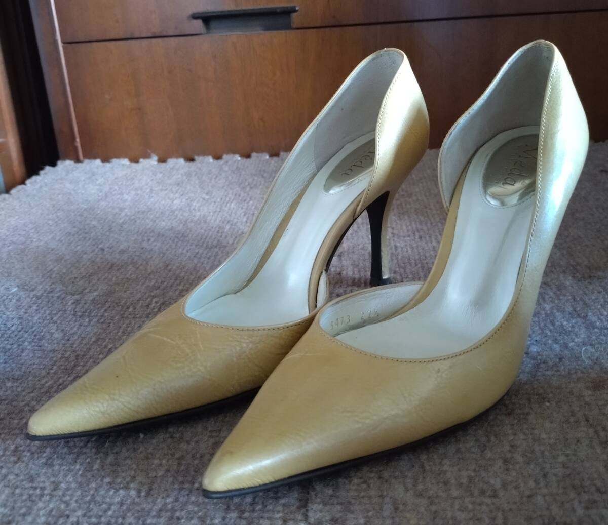 こちらのお色は薄ベージュで、サイズは22.5センチ、底甲幅は約センチ、ヒール高さは約8センチとなっております。