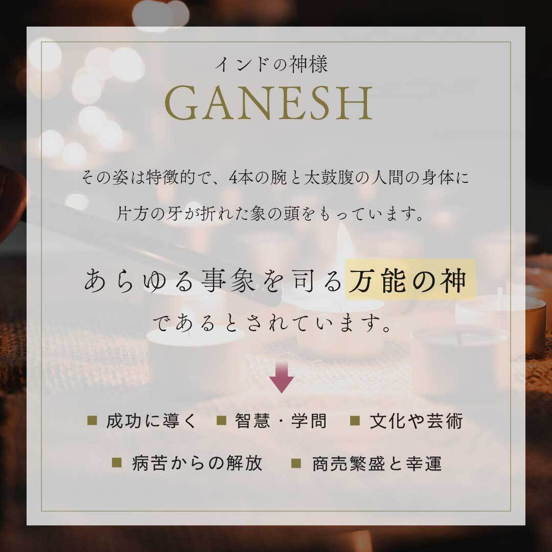ガネーシャ神は、あらゆる障害を除去して成功に導く神であり、商売繁盛をもたらす幸運な神であり、智慧を司る学問の神であり、文化や芸術を司る技芸の神であり、病苦からの解放をもたらす医術の神であり、あらゆる事象を司る万能の神であるとされています