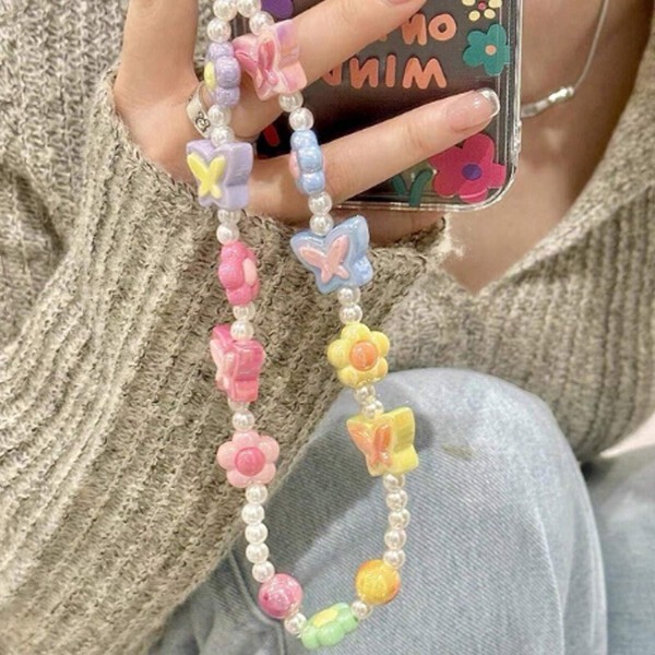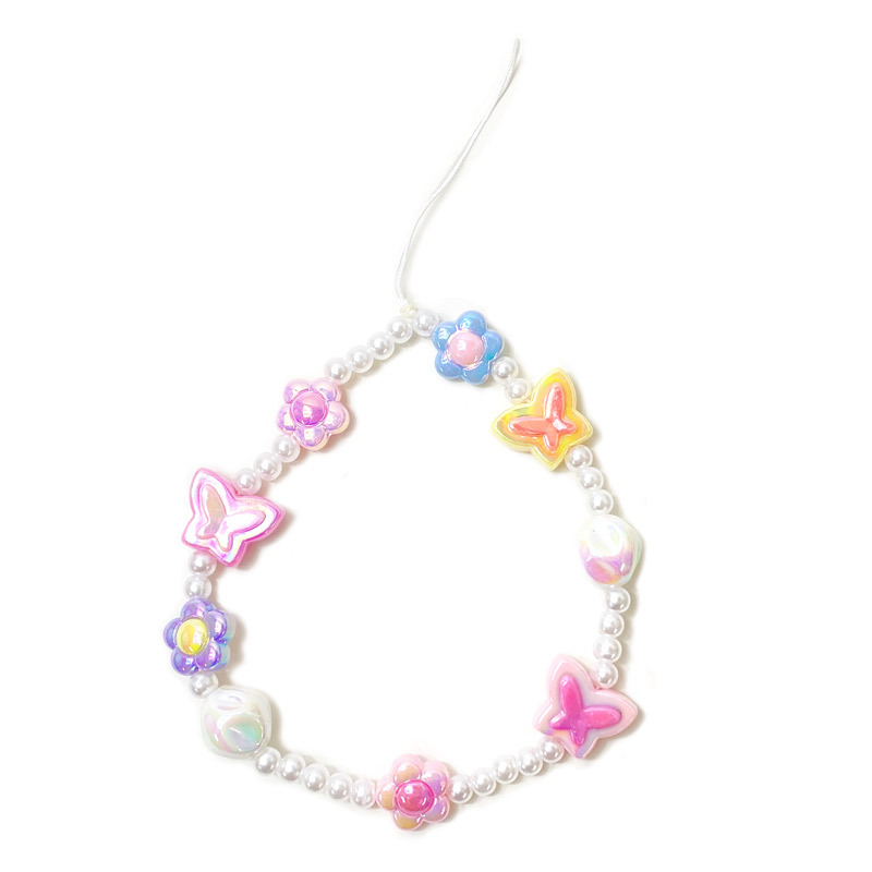 ビーズチャームストラップ 花と蝶々 リストストラップ ブルーフラワー