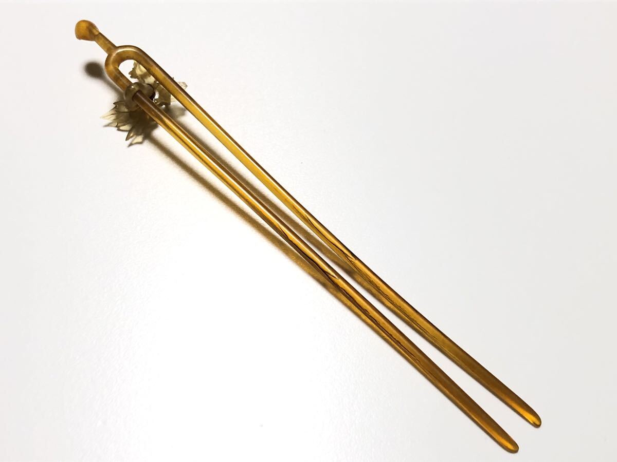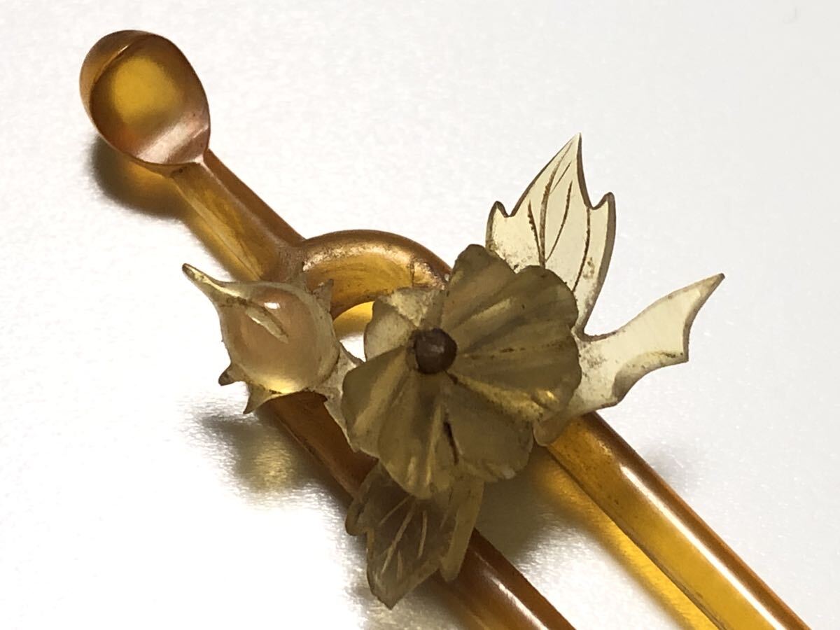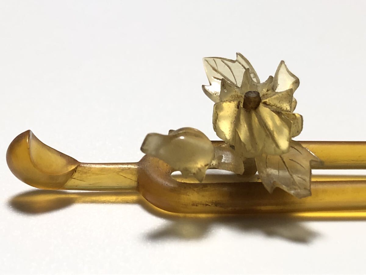 アンティークの白甲の本鼈甲、本牛甲を使用した、立体花細工の簪です。立体花細工の部分が本牛甲使用です。立体花細工の葉先に小さな虫食いが1ヶ所あります。若干、鼈甲張り合わせ部分の浮きがあります。