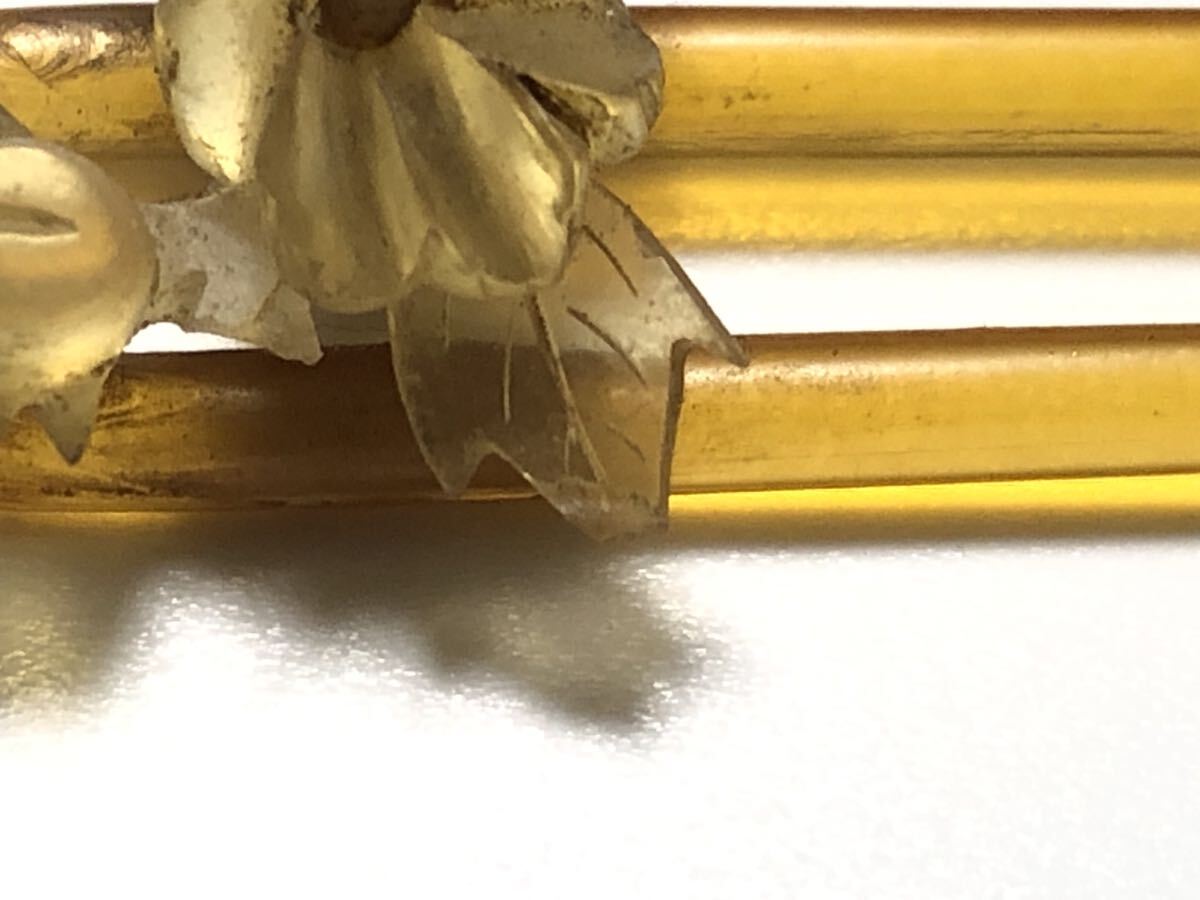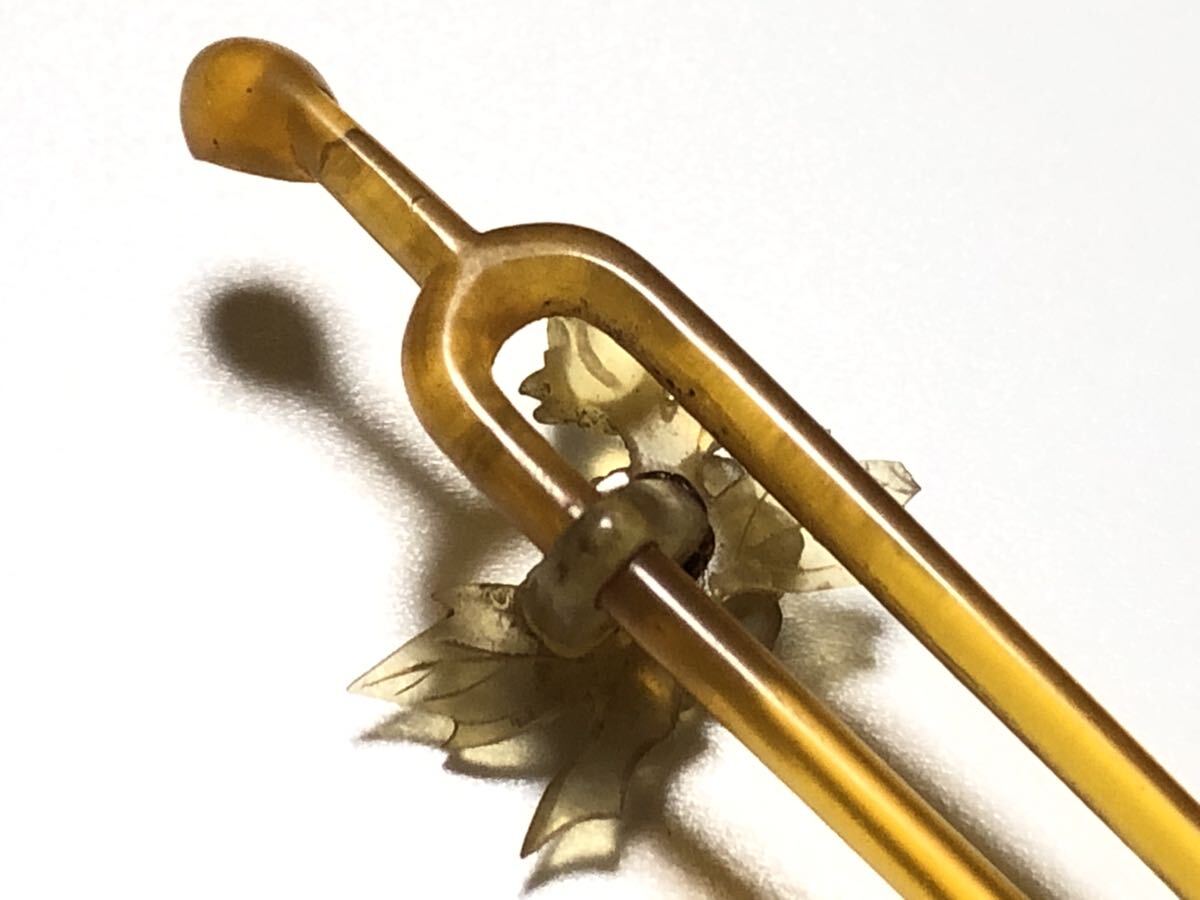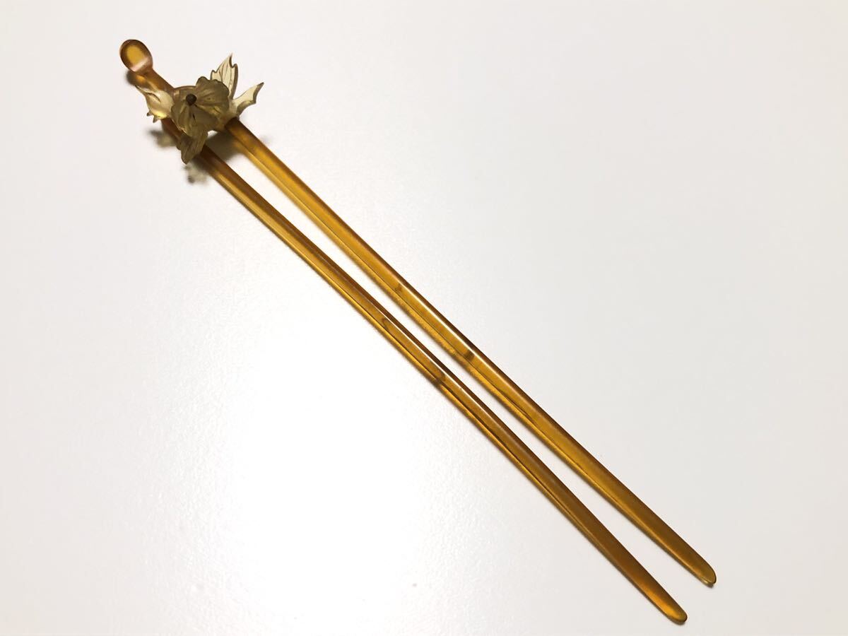 アンティークの白甲の本鼈甲、本牛甲を使用した、立体花細工の簪です。立体花細工の部分が本牛甲使用です。立体花細工の葉先に小さな虫食いが1ヶ所あります。若干、鼈甲張り合わせ部分の浮きがあります。
