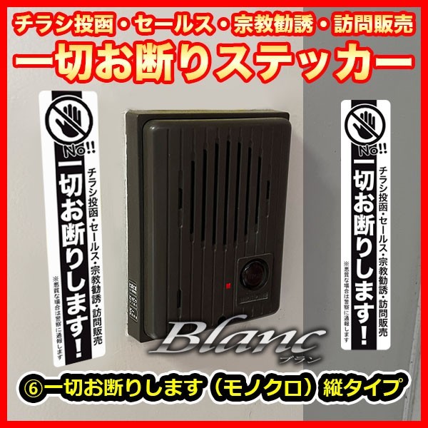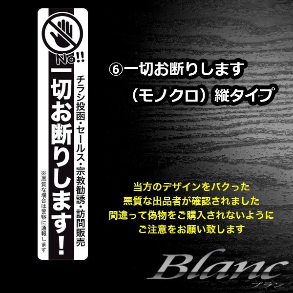 しつこい迷惑で悪質な訪問者に一切お断りステッカー! セールスマン、防犯対策、訪問販売、宗教勧誘、新聞勧誘、NHKに効果てきめん! ポストやインターフォン、玄関ドア付近にご利用ください。 ◎この商品は文字変更・サイズ変更ができません◎ 落札価格は1枚の価格です。 ●サイズ:縦150mm×横30mm ●耐候年数:3~5年 ●UV加工、防水加工 |
