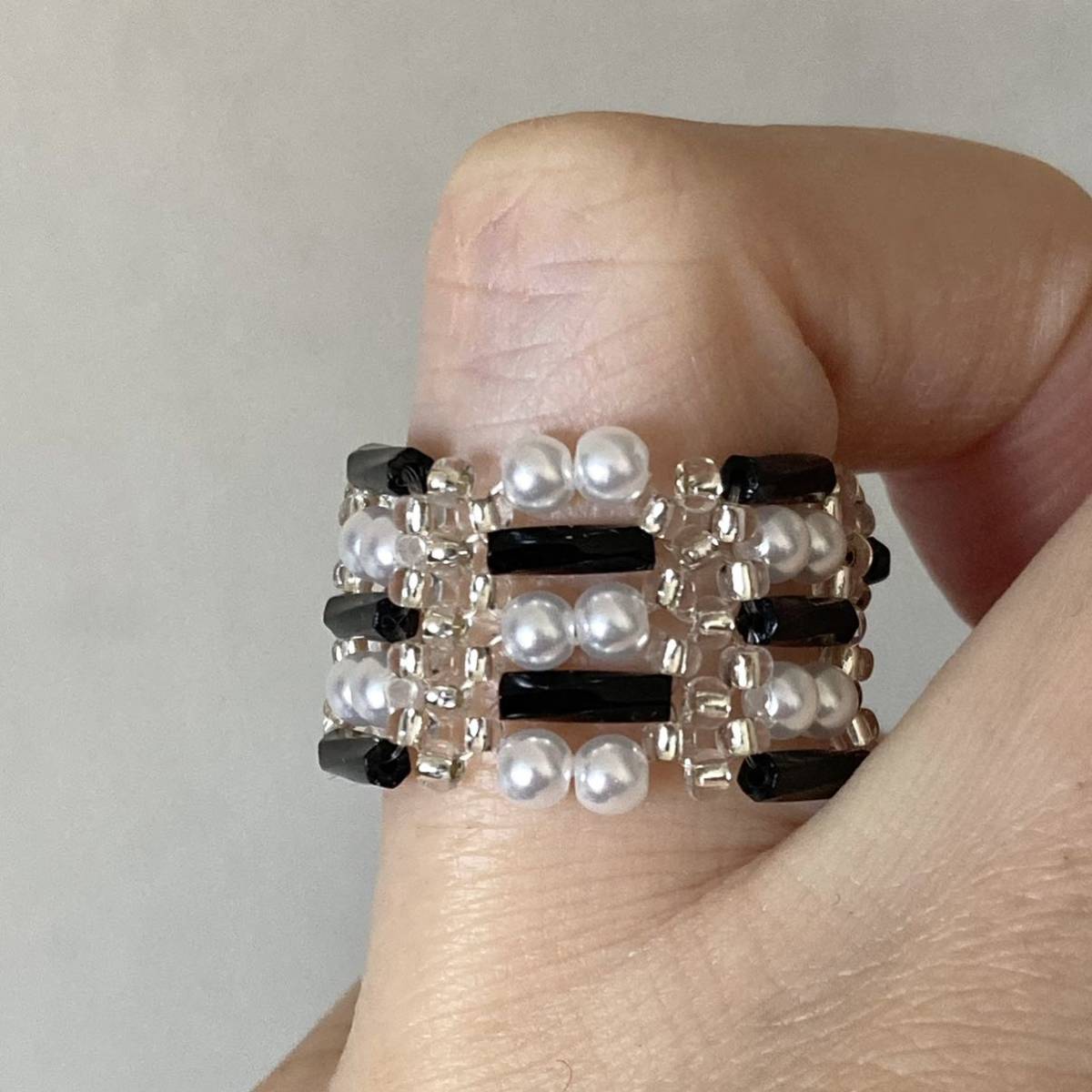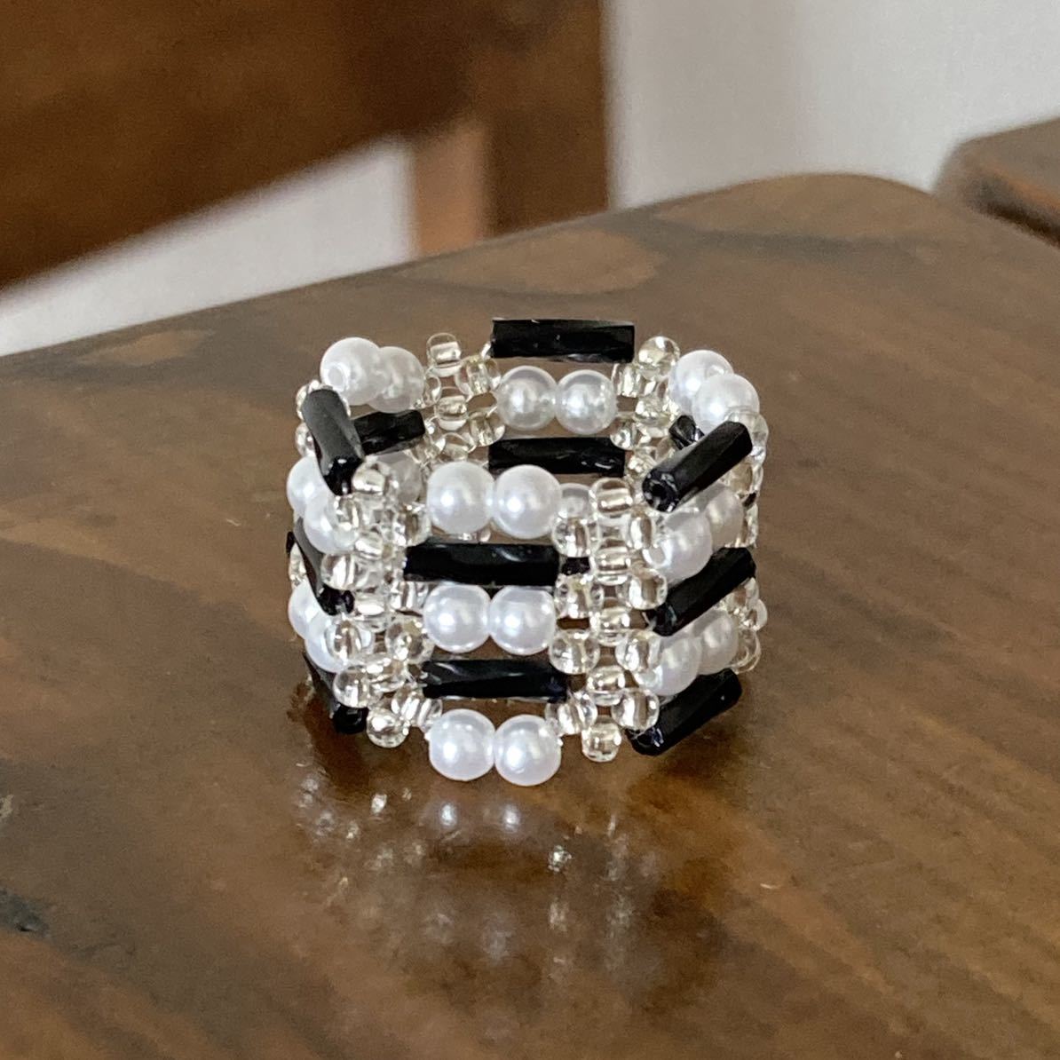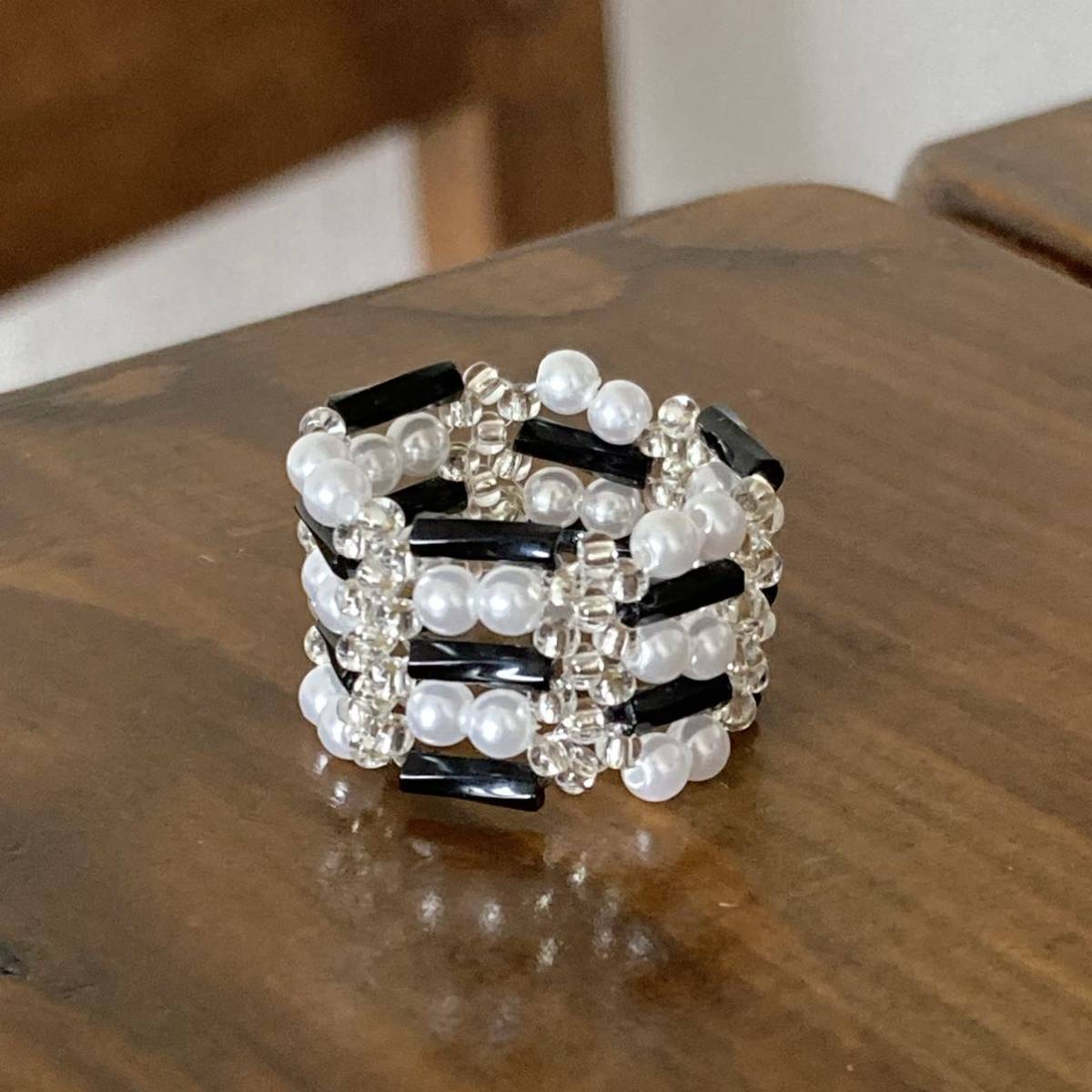 黒のツイスト竹ビーズ、白のミニパールビーズ、クリアシルバーの丸小ビーズで作ったリングです。
