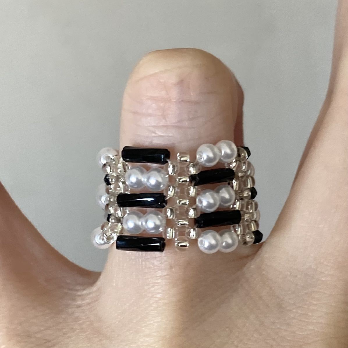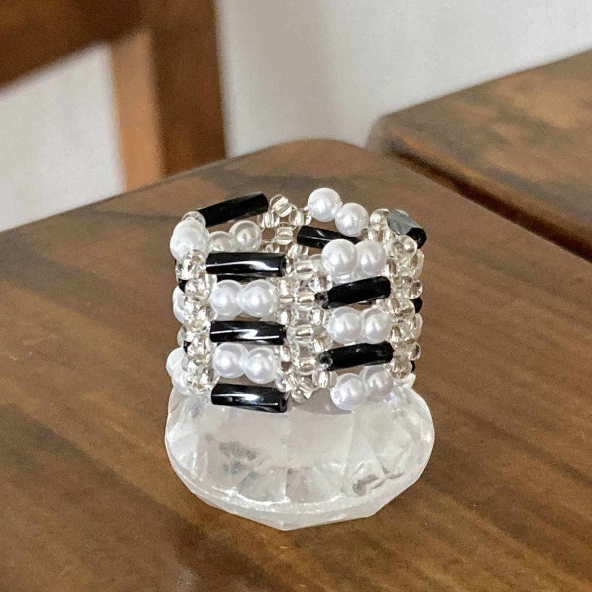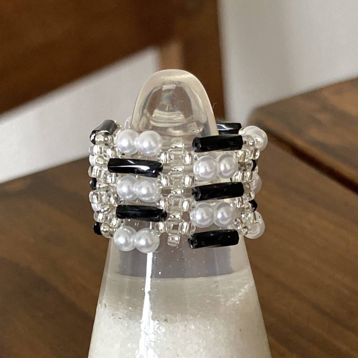 黒のツイスト竹ビーズ、白のミニパールビーズ、クリアシルバーの丸小ビーズで作ったリングです。