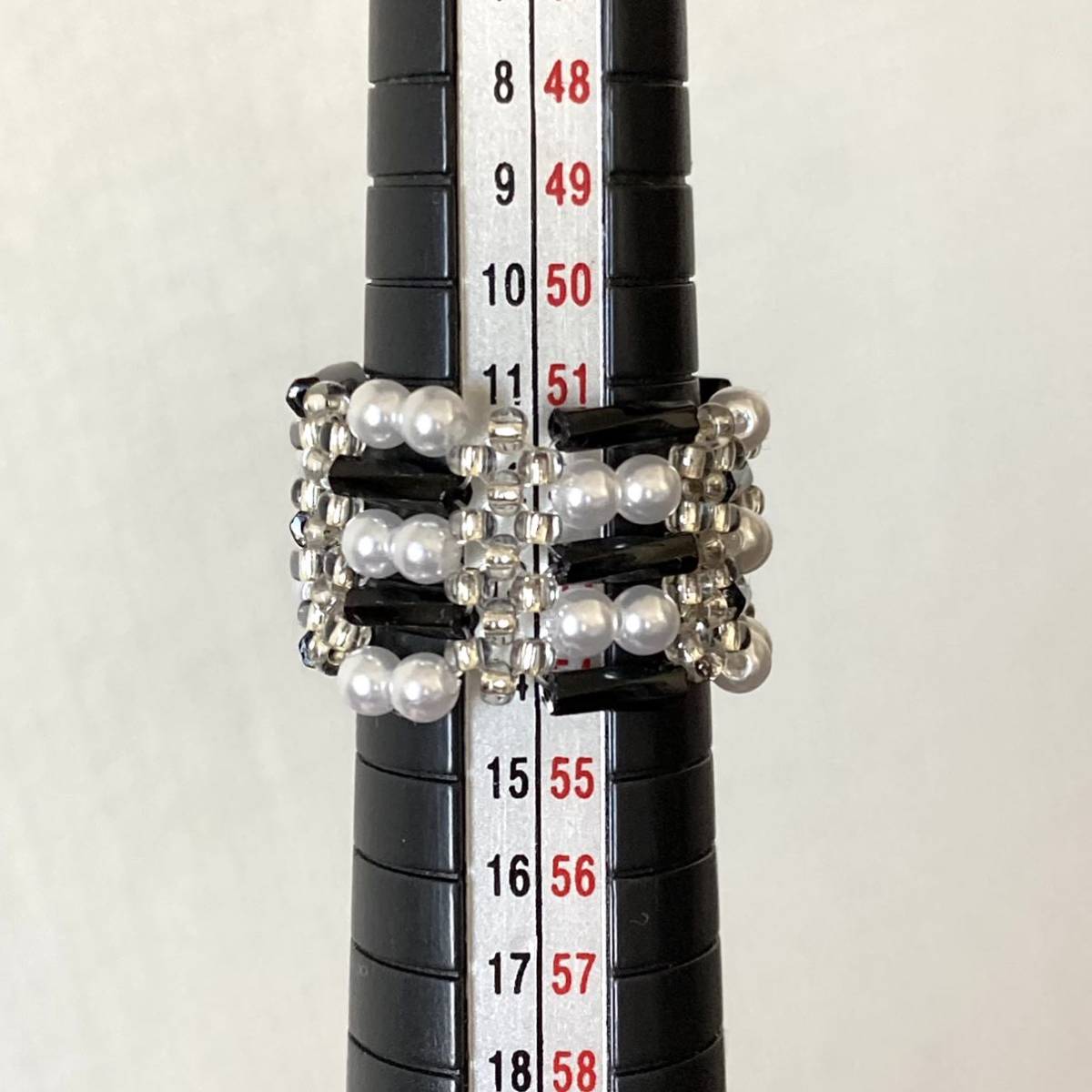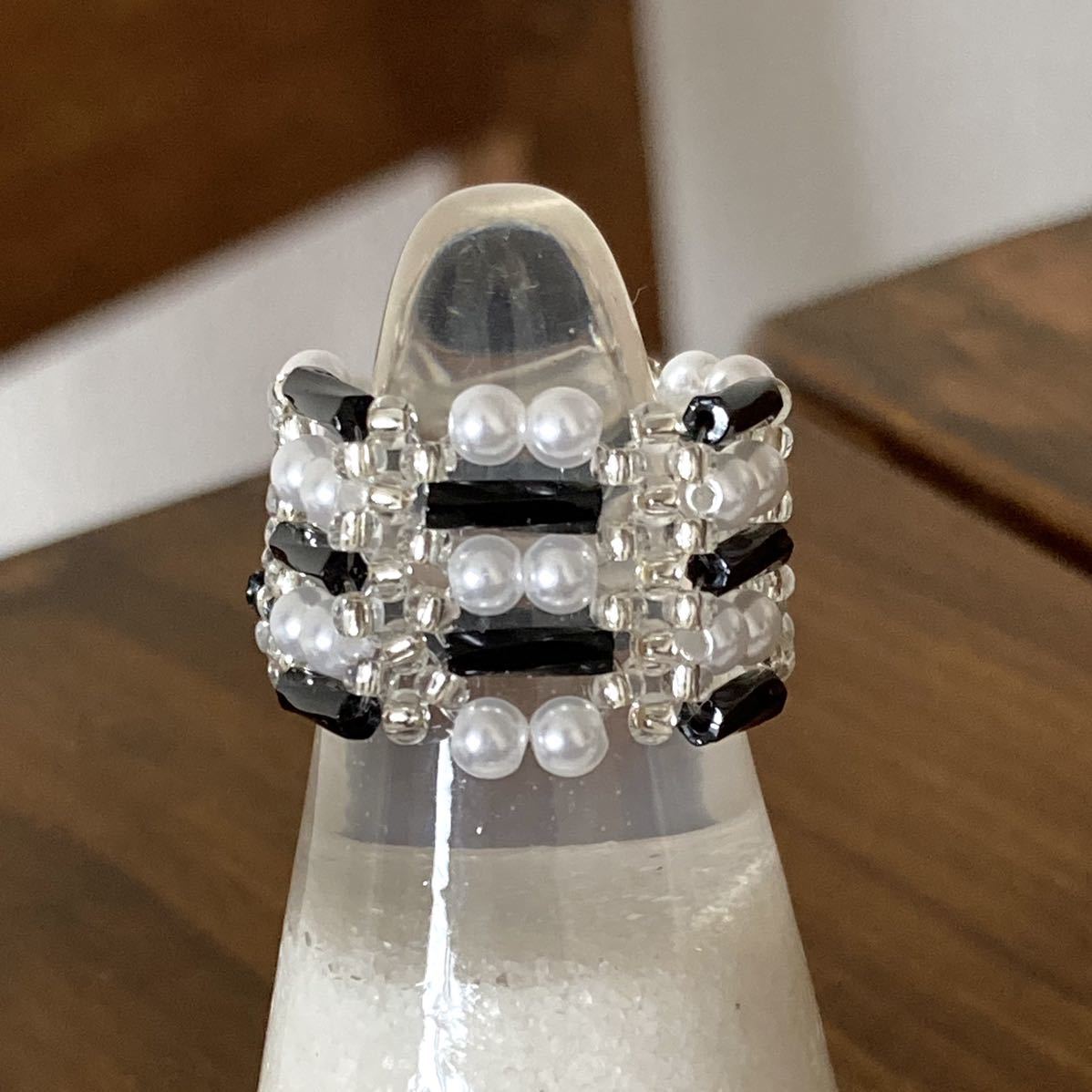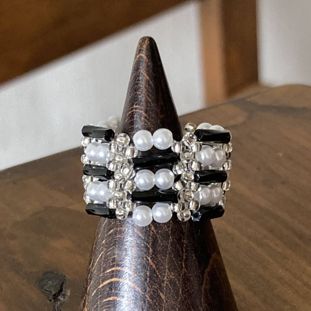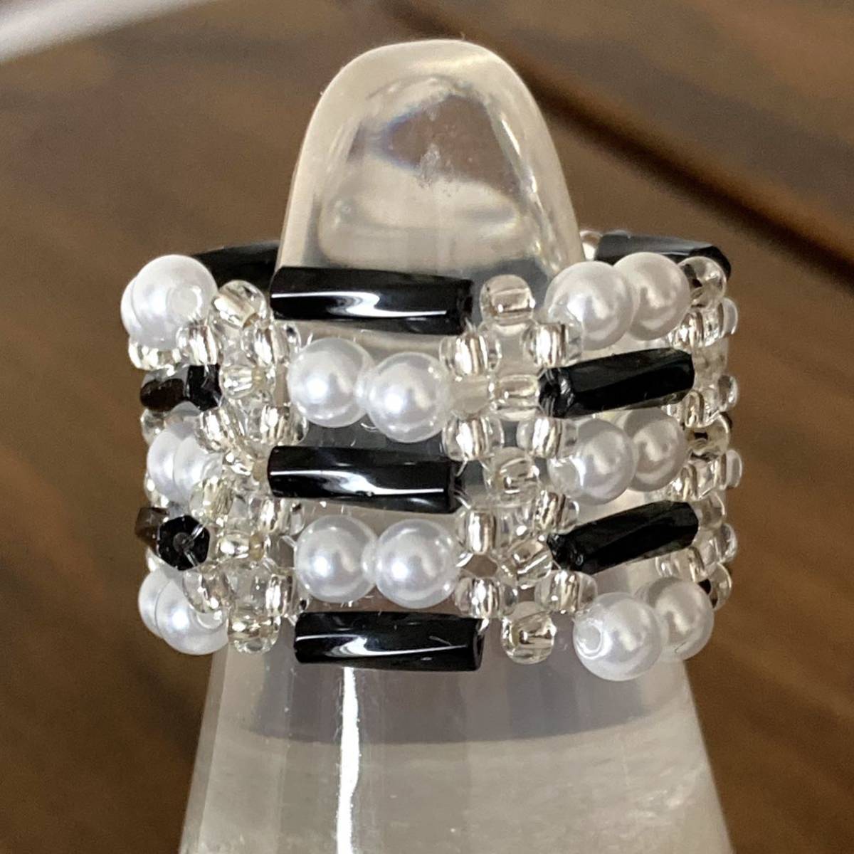 ビーズ リング 指輪 ハンドメイド ツイスト竹ビーズとミニパールのリング 黒×白 11ー13号です。