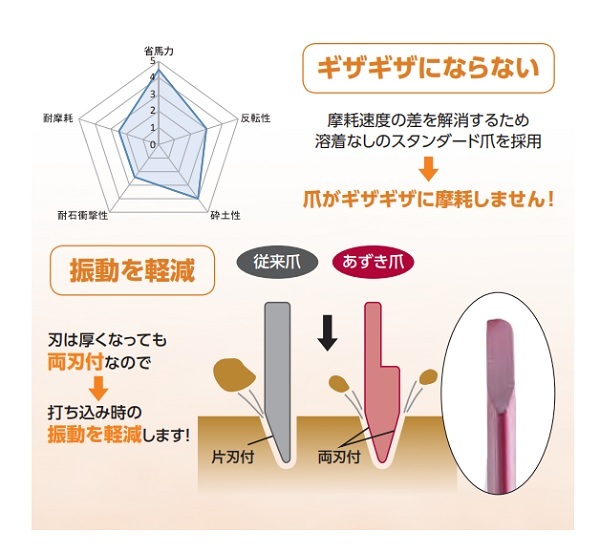 特徴・注意事項等 | 爪峯側の母材を刃縁側に寄せて厚みをもたせて爪幅を広くしG加工(溶着)無しでも長寿命です 刃先は両刃付きで打込み時の振動を軽減します 石礫が多く変摩耗する土質でも均等に摩耗します 離島・北海道は別途送料がかかります |