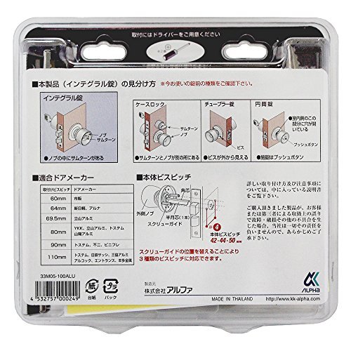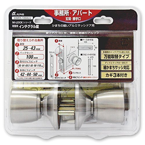 「ALPHA(アルファ) M-LOCKシリーズ 取替用インテグラル錠 33M05-TRW32D-ALU BS100」▼4532757000249▼(商品説明)用途:玄関・勝手口用(かまちの細いアルミサッシドア用)・取り替えられる条件1扉厚/25~43mm(br)2バックセット/100mm(br)3取付けビスピッチ/60・64・69.5・80・90・110(mm)(br)4本体ビスピッチ/42・44・50(mm)5フロントサイズ150x25mm・材質:ステンレス(ヘアーライン仕上げ)・多種類のインテグラル錠に対応できる万能取替タイプ。 ・デッドとラッチの一本化で細かまちサッシ対応。 ・カギ(キー)3本付。