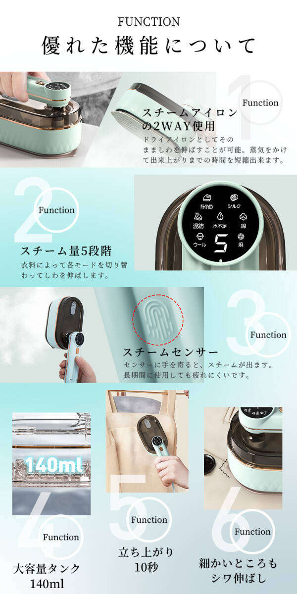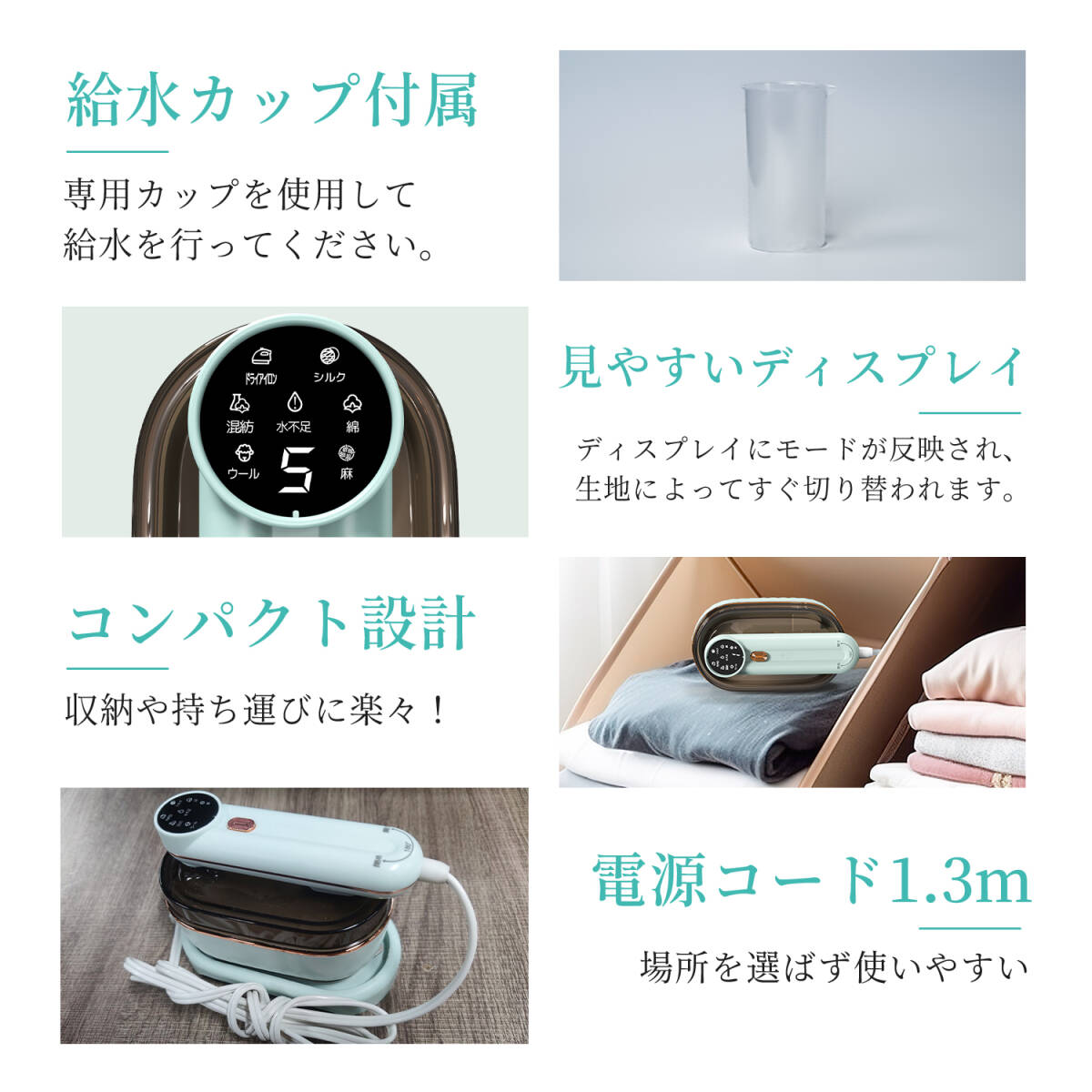 給水カップ付き 最大スチーム量約15g/分 どんな向きでも使える 生地五つ対応可能