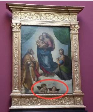 名作『システィーナの聖母』は、祭壇画の一翼として描かれ、ラファエロが描いた最後の聖母マリアであり、ラファエロが自身だけで完成させた最後の絵画です。また、中央にたたずむ聖母マリアの足下に描かれている翼を持った二人のエンジェルは、この絵画自体の評価とは無関係に非常に有名なイメージになっています。現在はドイツ・ドレスデンのアルテ・マイスター絵画館に収蔵・展示されています。