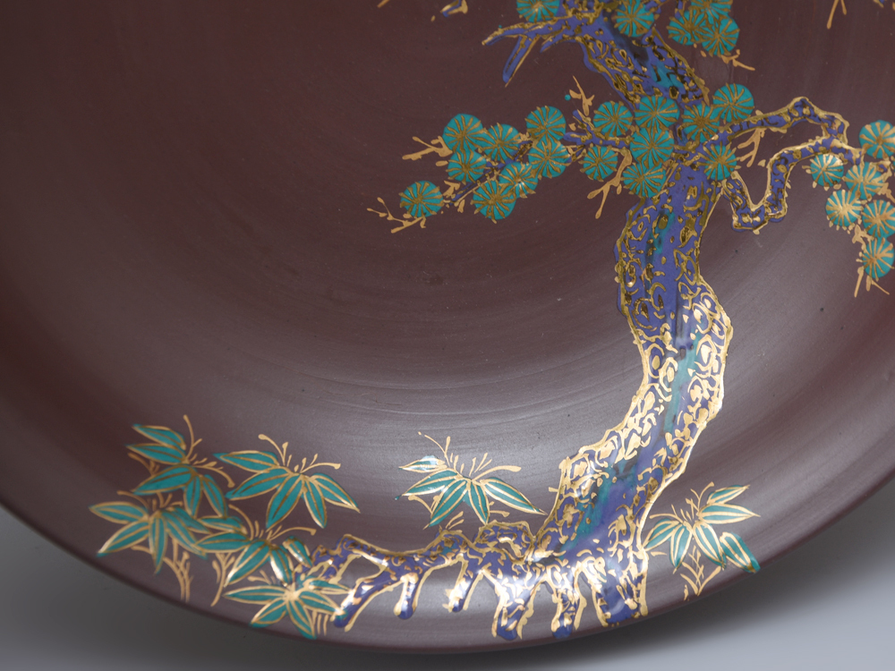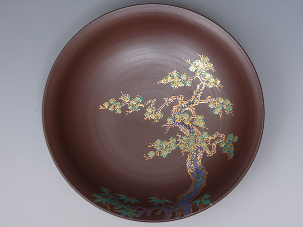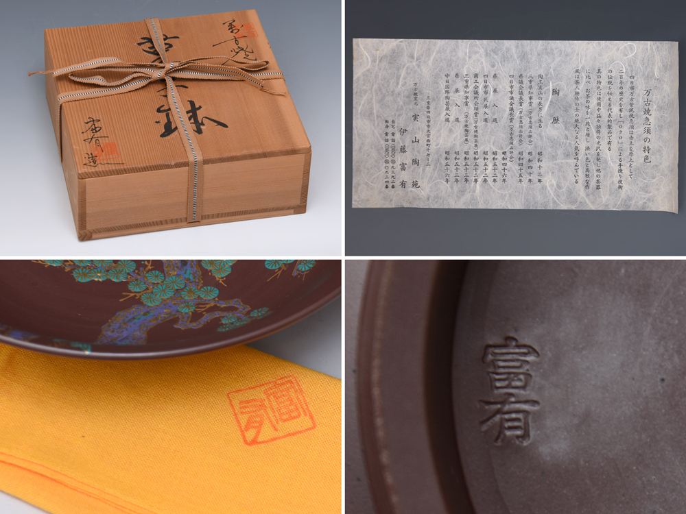 実山陶苑 伊藤富有(造)色絵老松図 萬古焼 菓子鉢 菓子器 茶道具 煎茶道具 共箱 しおり 共布 |