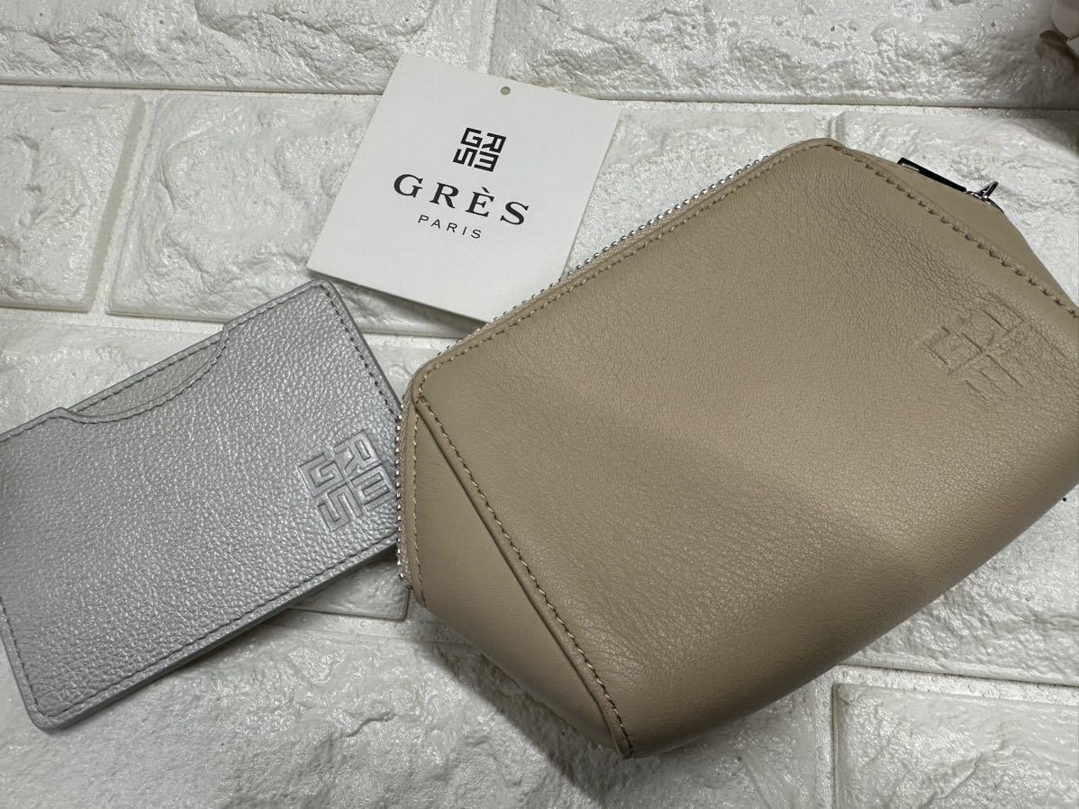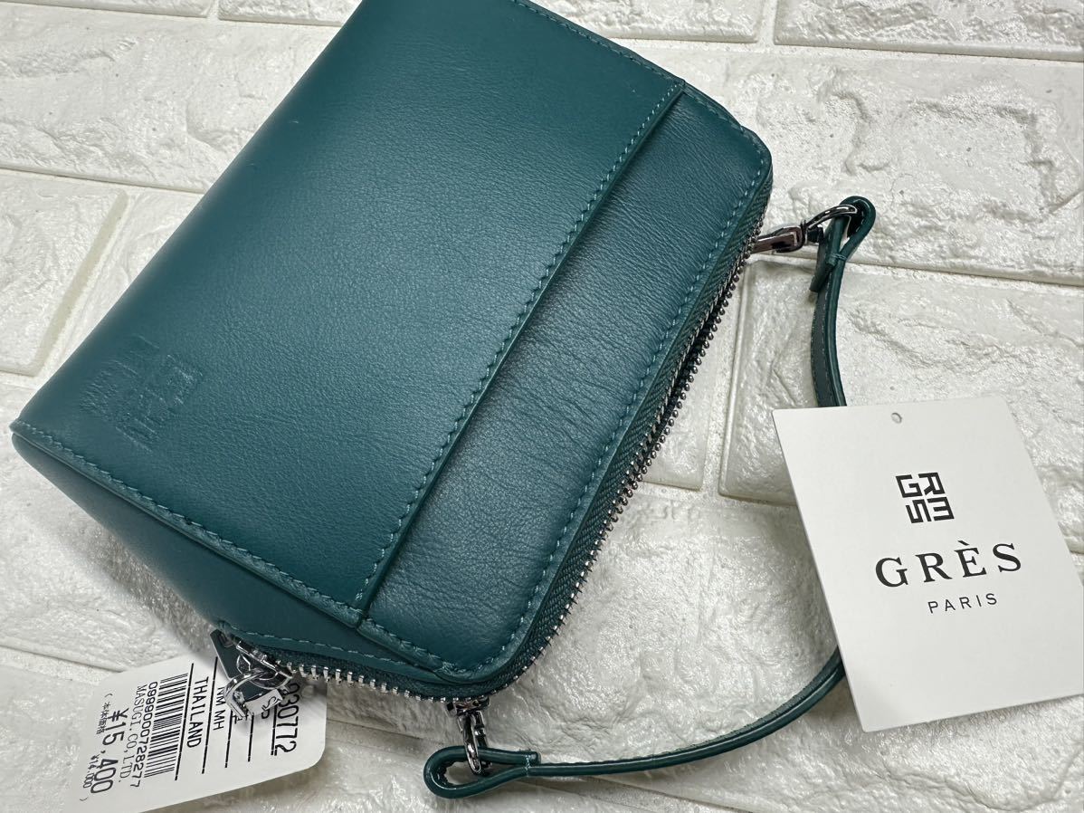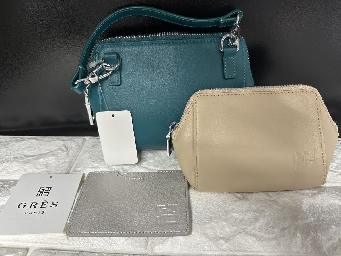 新品 GRESグレ 牛革 レザー ミニバック ポーチ カードケース 3点セット グリーン ウォレット 定価15400円