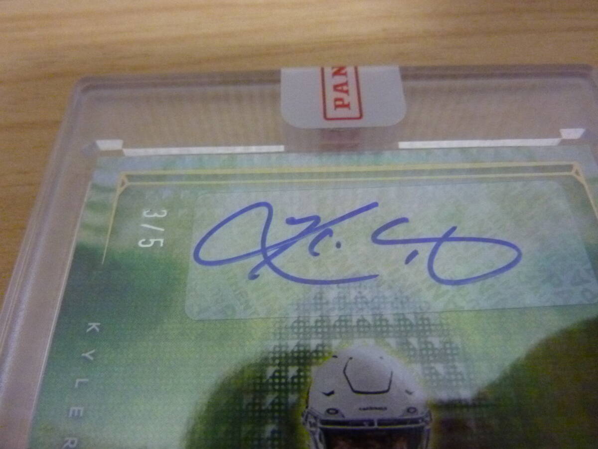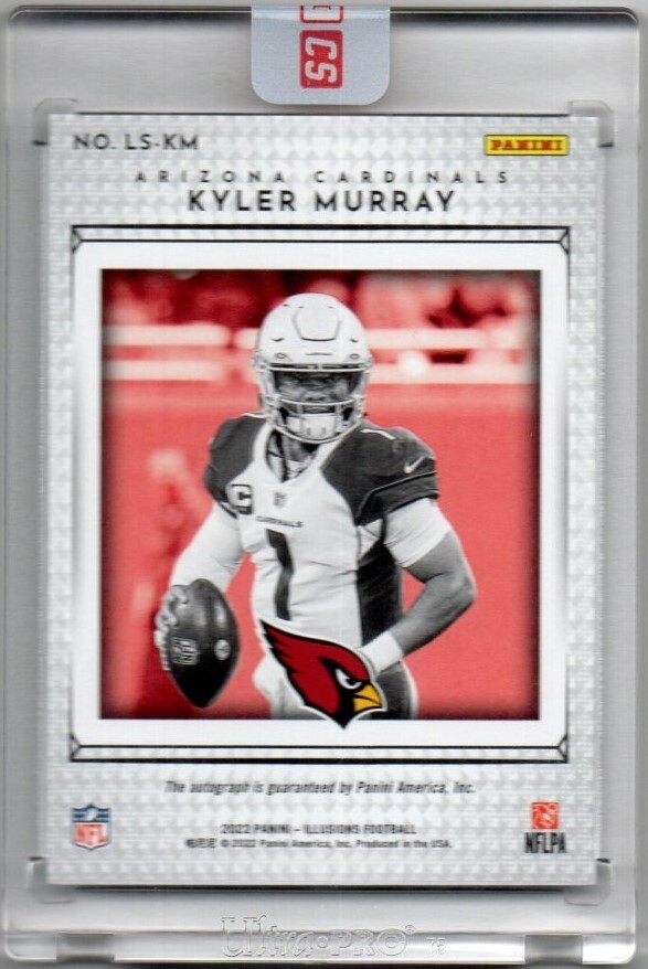 2022 Panini ILLUSIONS Football、カードLS-KM アリゾナ・カージナルスのQB「KLYLER MURRAY」のゴールド・パラレル版直筆サインカード、5枚限定です。レデンプションカードで引き当て、パニーニ社から返送されたままの状態でカードの状態も良好です。