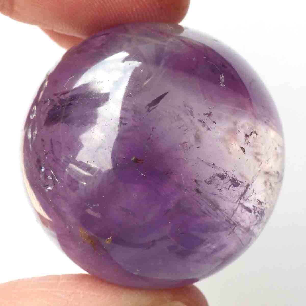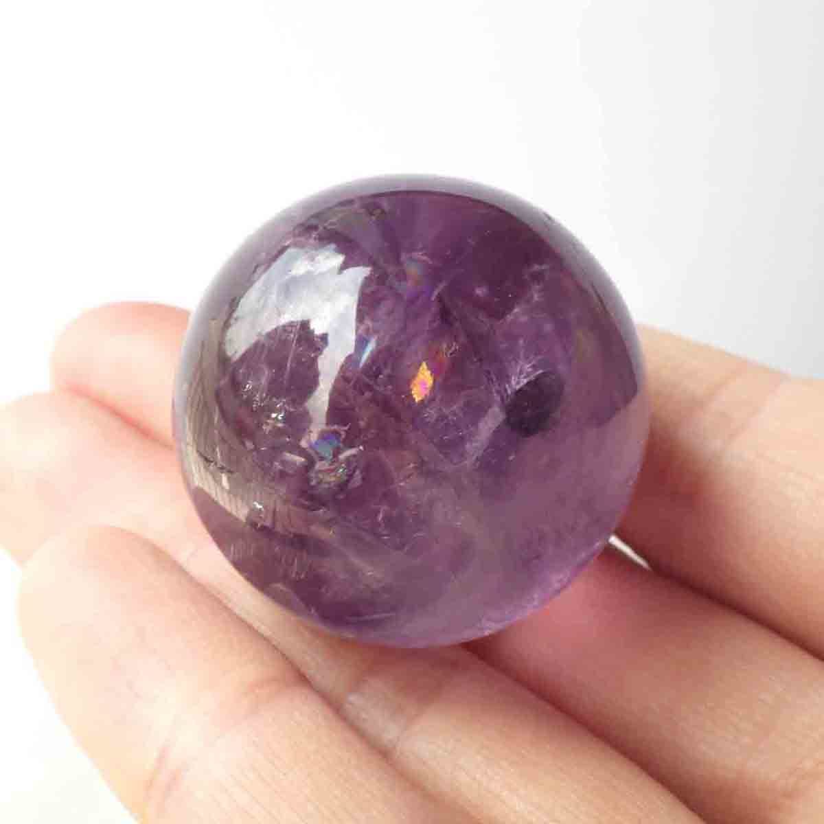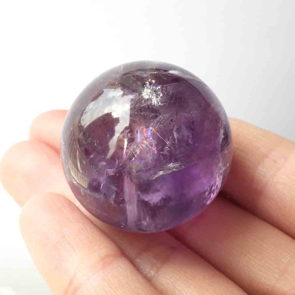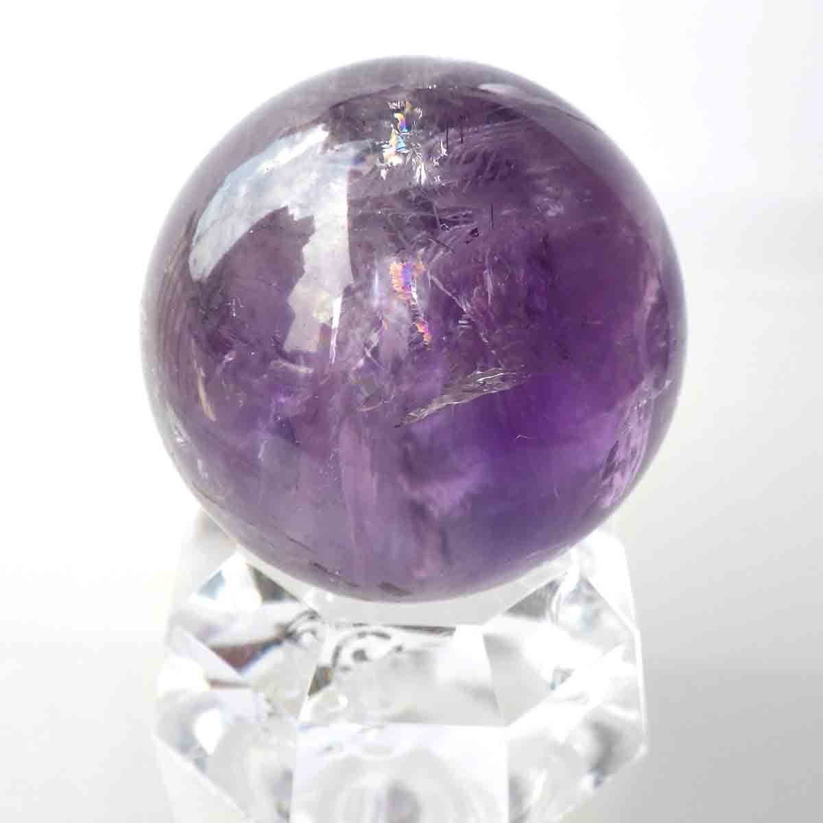 ブラジル産の高品質のアメジスト球です。素晴らしい透明度を持ったアメジストで色はほぼ均一の濃い紫。内部の鏡面によりレインボー、表明にはキャッツアイの様な光の筋も見られます。透明度が高いのでいろんな表情が見られます。光に透かして見たり、くるくると回してみたり、お気に入りの場所に飾ってみたり、実際に手に取って楽しんでいただきたい一点です。