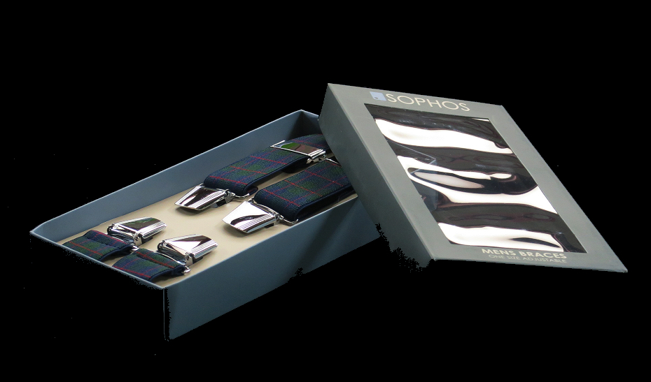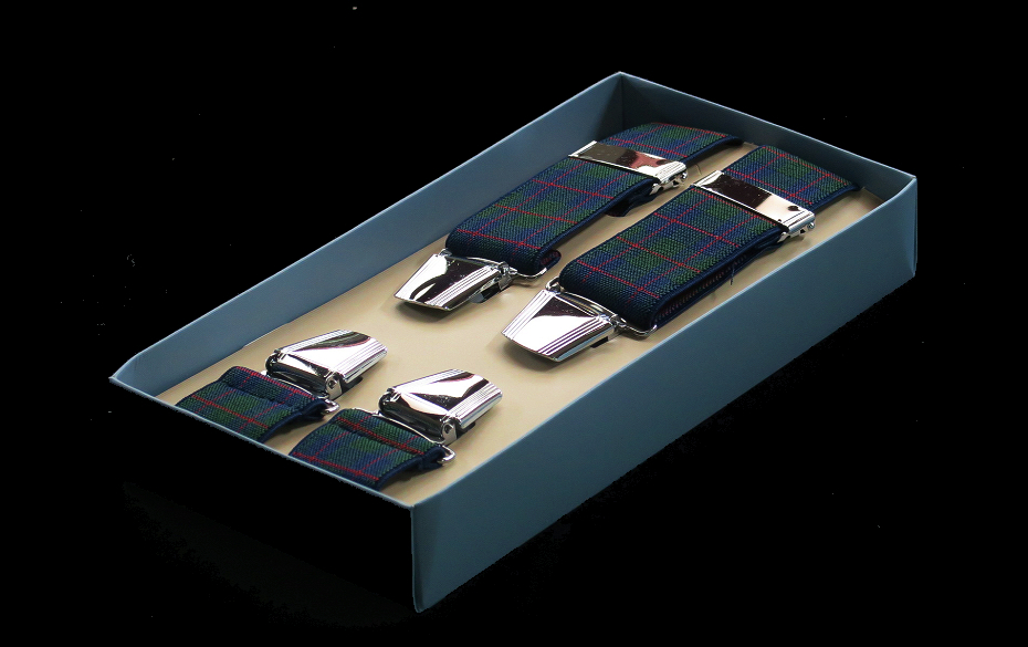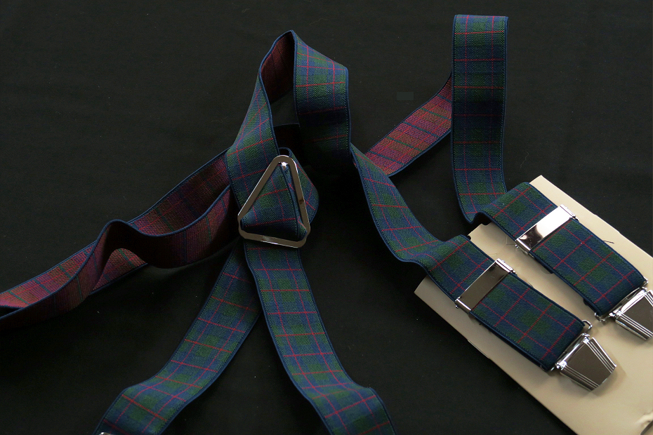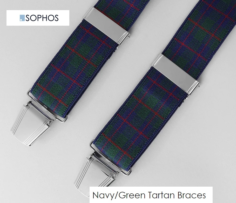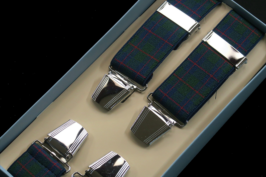 ★イギリス U.K SOPHOS サスペンダー 35mm X型 シルバークリップ 幅広バックル タータンチェックグリーン Navy Green Tartan Brace
