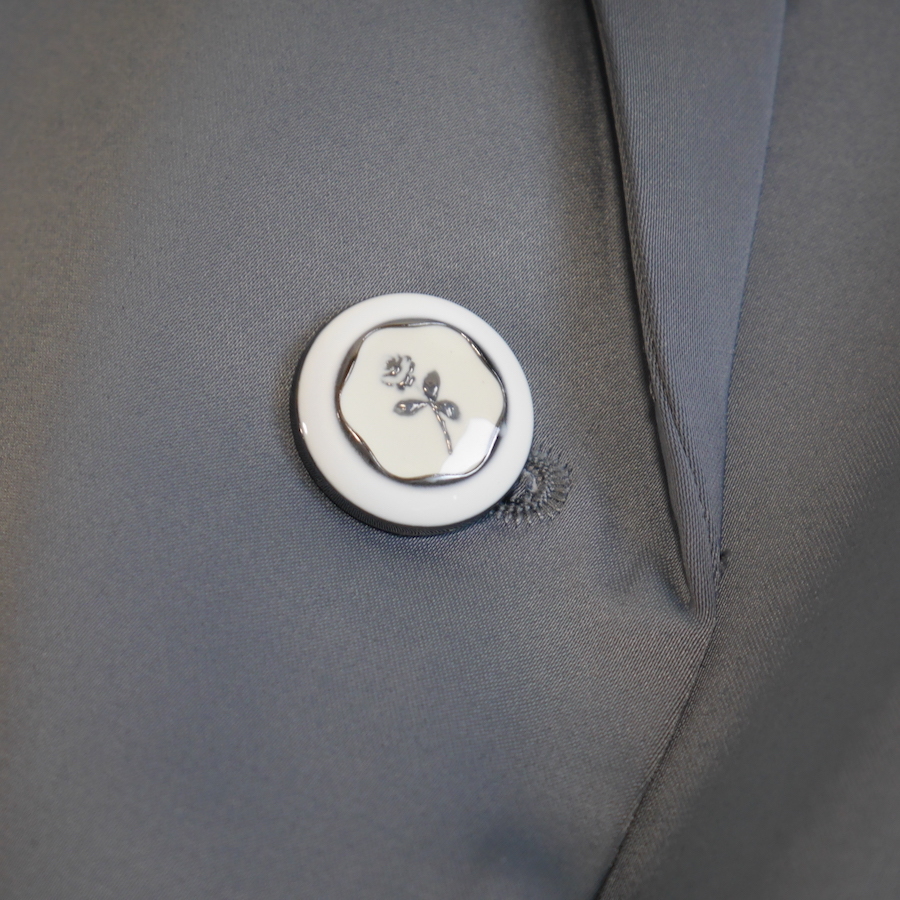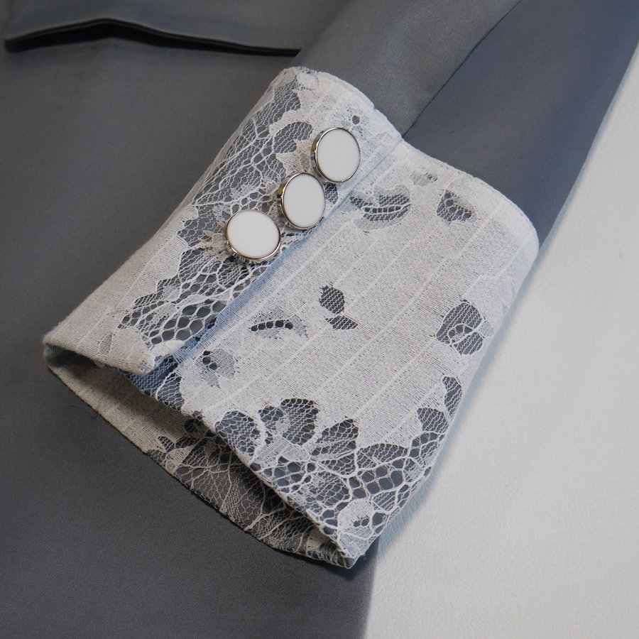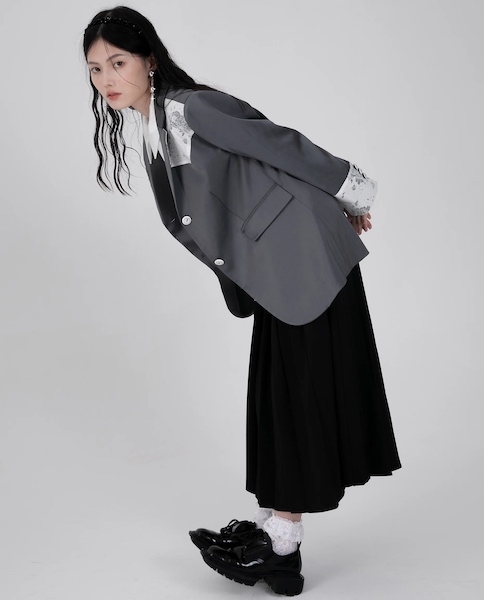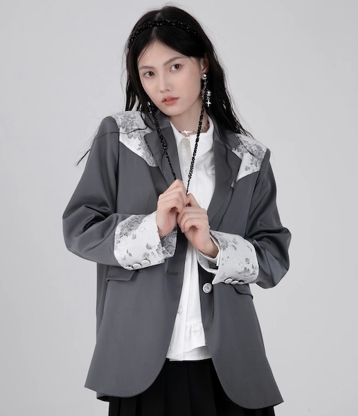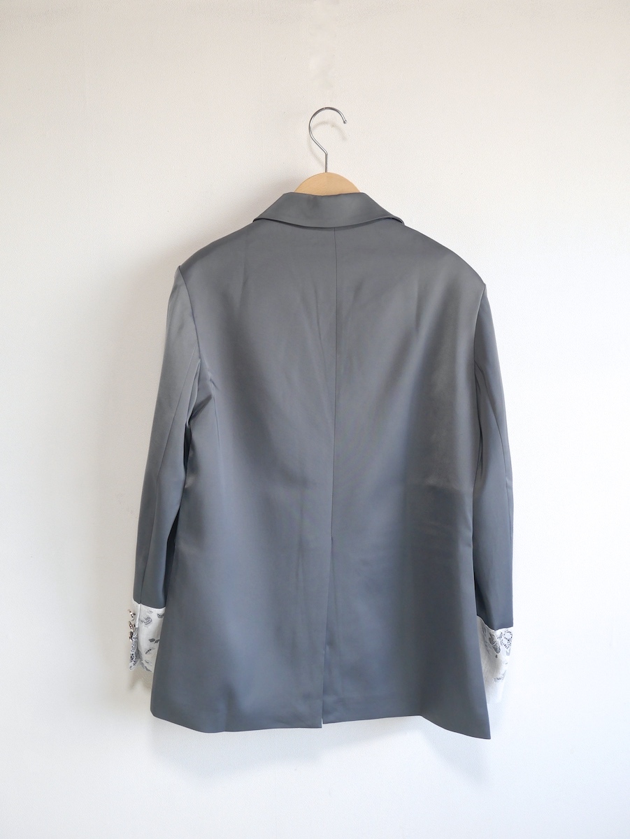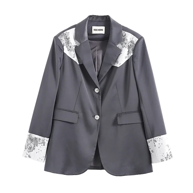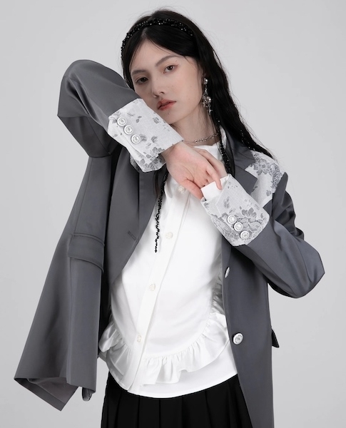 マニッシュなジャケットにフェミニンな印象のレースをあしらったテーラードジャケット。
