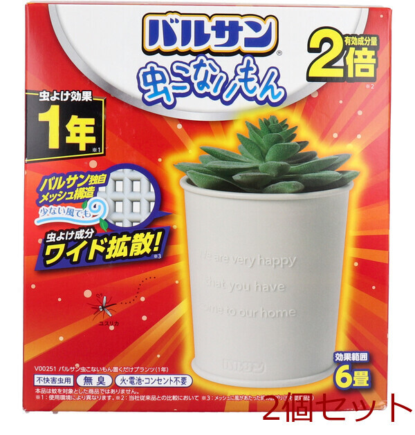 安心、お手軽。 置いておくだけの簡単虫よけ! 火・電池・コンセントは不要! ・効果は約1年間! ながーく虫よけ効果を発揮。 (使用環境により異なります。) ・モーター・ファンレス設計の無音タイプ。 ・寝室や静かな場所にもピッタリ。 ・交換時期を自動でお知らせ! ・無臭。 【適用害虫】 ユスリカ 【使用の目安 】 6畳までの広さの部屋に対し1個 【使用期間】 約1年間 (使用環境により異なります) 【有効成分】 トランスフルトリン (ピレスロイド系) 【設置場所】 ★いやな虫が潜んでいそうな場所、または飛来しそうな場所に設置してください。 ・玄関、寝室、リビング・窓際、トイレ ★効果を高めるポイント 空気の流れのある窓や出入り口付近に設置すると効果的です。 個装サイズ:142X156X112mm 個装重量:約198g 内容量:1個入 製造国:中国 【発売元:レック株式会社】 【使用方法】 (1)袋を開け、カートリッジを取り出します(薬剤の揮散が始まります)。 (2)カートリッジのつまみに開封した日付を油性ペンで書き込みます。 (3)本体底面の差込口に、カートリッジの凸部分と本体の・印を合わせ、差し込みます。 (4)矢印の方向にLOCKの位置まで回します。 【使用上の注意】 ・本来の用途以外には使用しないでください。 ★してはいけないこと ・カートリッジの中からメッシュを取り出さないでください。 ・植物は本物ではありません。 水などをあげないでください。 ★相談すること ・万一身体に異常を感じた場合は、本品がピレスロイド系の殺虫剤であることを医師に告げて、診療を受けてください。 ★その他の注意 ・商品表示をよく読み、使用方法を守って使用してください。 ・カートリッジ中のメッシュに手を触れないでください。 誤って触れた場合は石けんでよく洗ってください。 ・アレルギー症状やかぶれを起こしやすい体質の人は、注意して使用してください。 ・小児やペットがもてあそぶ場所へ置かないでください。 ・観賞魚などのいる水槽の近くに本品を置かない、または水槽に本品が入らないようにしてください。 ・閉め切った部屋や狭い部屋で使用する場合は、時々部屋の換気をしてください。 ・本品は通常1年間効果が持続しますが、使用環境により早く終了する場合があります。 ・害虫が大量に発生し、次々に飛来する場合などは、殺虫エアゾールと併用してください。 ★保管および取扱い上の注意 ・火気付近、直射日光の当たる場所、高温になる場所を避け、小児やペットの手の届かない涼しいところに保管してください。 ・一旦使用を中断する場合は、吸着シートに保護フィルムを貼りビニール袋やラップなどに包み、密封して保管してください。 ・使用済みの本品は、他に転用しないで各自治体の定めによる方法に従って廃棄してください。 注意事項 ※予告なく成分・パッケージが変更になることがございます。 予めご了承ください。 *予告なく成分・パッケージが変更になることがございます。予めご了承ください *ダンボールを使用して発送する場合には、入数以下の個数の場合、 中古ダンボールを使用する場合があり、ご注文の商品とは異なるダンボールになる場合があります。 あらかじめ、ご了承ください。 |