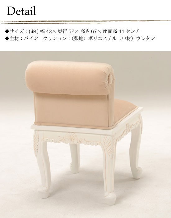 エレガントスツール ホワイト色 VIOLETTA(ヴィオレッタ)シリーズ RH-1774AW 完成品※エレガントな彫刻とねこ脚、古くから使い込んだような味わいのアンティーク風スツールです※エレガントなデザインでお部屋に高級感がでます※届いてすぐに使える完成品です◆サイズ:(約)幅42×奥行52×高さ67×座面高44センチ◆主材:パイン クッション:(張地)ポリエステル(中材)ウレタン◆姫系デザイン◇《1日~2日(土日除く)での発送となります》《新品番:RH-1774AW-NBE》☆落札、ご入金確認後 1~2日にて発送いたします 追加納期のかかるものは商品ページに記載いたしております よろしくお願いいたします。