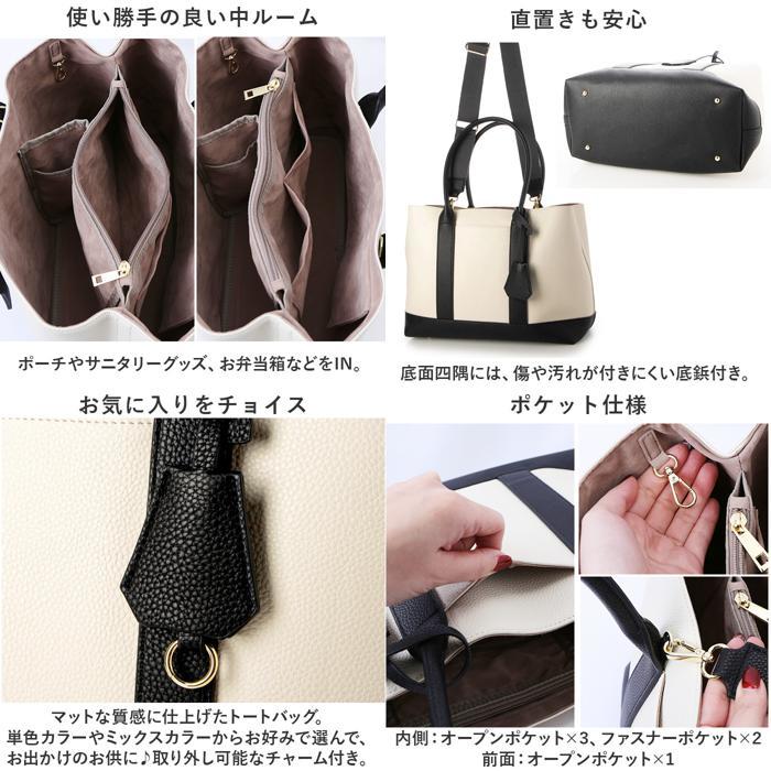商品説明 | ・・オン・オフ問わず大活躍!cache cache(カシュカシュ)から、たっぷり収納できて整理整頓がラクラク!ショルダー付きパーテーショントートLサイズが新登場。 ・【落ち着きのある仕上がり】 ・シボ感のあるフェイクレザーを使用。シーンを選ばず使えて、カジュアルにもキレイめにもマッチ☆ ・【安定感をキープ】 ・小物を収納しやすく安定感のあるスクエアフォルム。荷物を入れていない状態でも自立。 ・【持ち方を選べる2wayタイプ】 ・手持ちではもちろん、長さ調節可能なショルダーベルトを取り付けて肩掛けや斜め掛けも自在。ショルダーは肩に食い込みにくい幅広仕様。 ・【オープン開口】 ・開口部はガバっと開くオープンタイプ。中身が見やすく、取り出しもスムーズ。内側に目隠し布付き。 ・【仕切り付きの3ルーム仕様】 ・内側は3ルームに分かれており、急いでいる時も中身がひと目で確認できて誰でも収納上手に♪内生地は小物を傷つけにくい、しっとりとした生地感。(※仕切りの底は縫い付けられておりません。) ・【A4サイズ対応の大ルーム】 ・A4サイズのファイルが横向きにすっぽり。通勤・通学にも最適。 ・【使い勝手の良い中ルーム】 ・ポーチやサニタリーグッズ、お弁当箱などをIN。 ・【ペットボトルが収納できる小ルーム】 ・ペットボトルや折りたたみ傘が倒れることなく、安定した状態で持ち運べちゃう! ・【サッと取り出せるポケット】 ・内側に5つ、前面に1つポケットを配置。小物が迷子になりにくく、必要な時にすぐに取り出しOK。 ・【直置きも安心】 ・底面四隅には、傷や汚れが付きにくい底鋲付き。 ・【お気に入りをチョイス】 ・マットな質感に仕上げたトートバッグ。単色カラーやミックスカラーからお好みで選んで、お出かけのお供に♪取り外し可能なチャーム付き。 ・【ポケット仕様】 ・内側:オープンポケット×3、ファスナーポケット×2 ・前面:オープンポケット×1 |