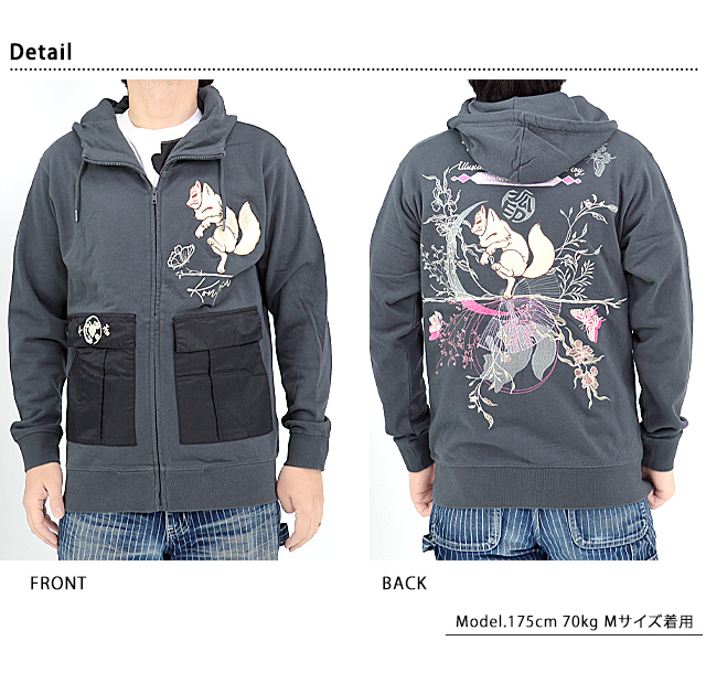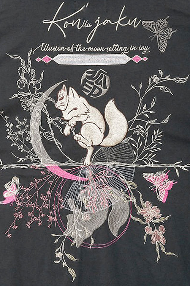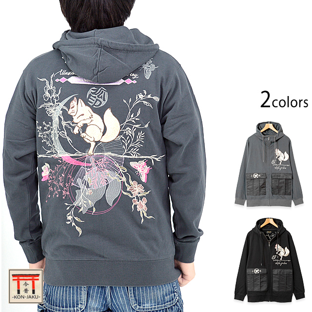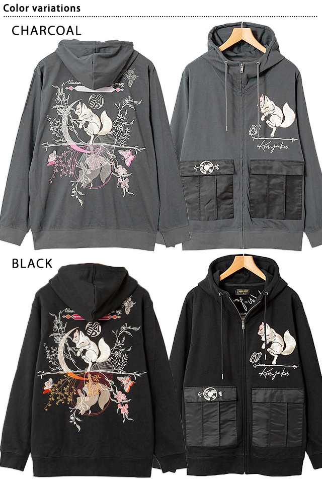 愛らしい狐のキャラクターが主役の【今昔】から「蔦に月が沈む幻影」総刺繍ナイロンポケットパーカー(KJ-29169)のご紹介です。 今昔の新作はポケットにナイロン素材を切り替えた、今までとは一味違うジップパーカーです。 背中には蔦に月が沈んでいくデザインが描かれています。 蔦の上にいる狐の背景はモノトーンの世界になっており、逆に蔦の下に映る狐の影の世界はカラーで表現した、幻想的なバックスタイルです。 ボディーは裏毛タイプのスウェットを採用。 | |||||||||||||||||||||||||