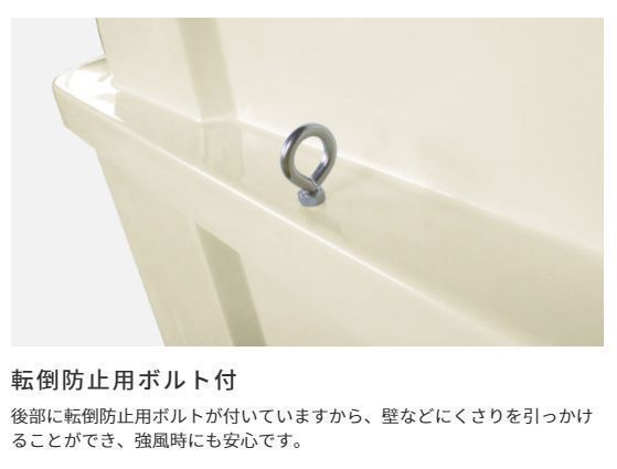 | ・転倒防止用ボルト付 後部に転倒防止用ボルトが付いていますから、壁などにくさりを引っかける ことができ、強風時も安心です。 | ||||||||||||||