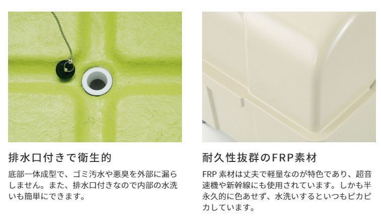 | ・排水口付きで衛生的 底部一体成型で、ゴミ汚水や悪臭を外部に漏らしません。 また、排水口付きなので内部の水洗いも簡単安全に配慮したカタチにできます。 | ||||||||||||||